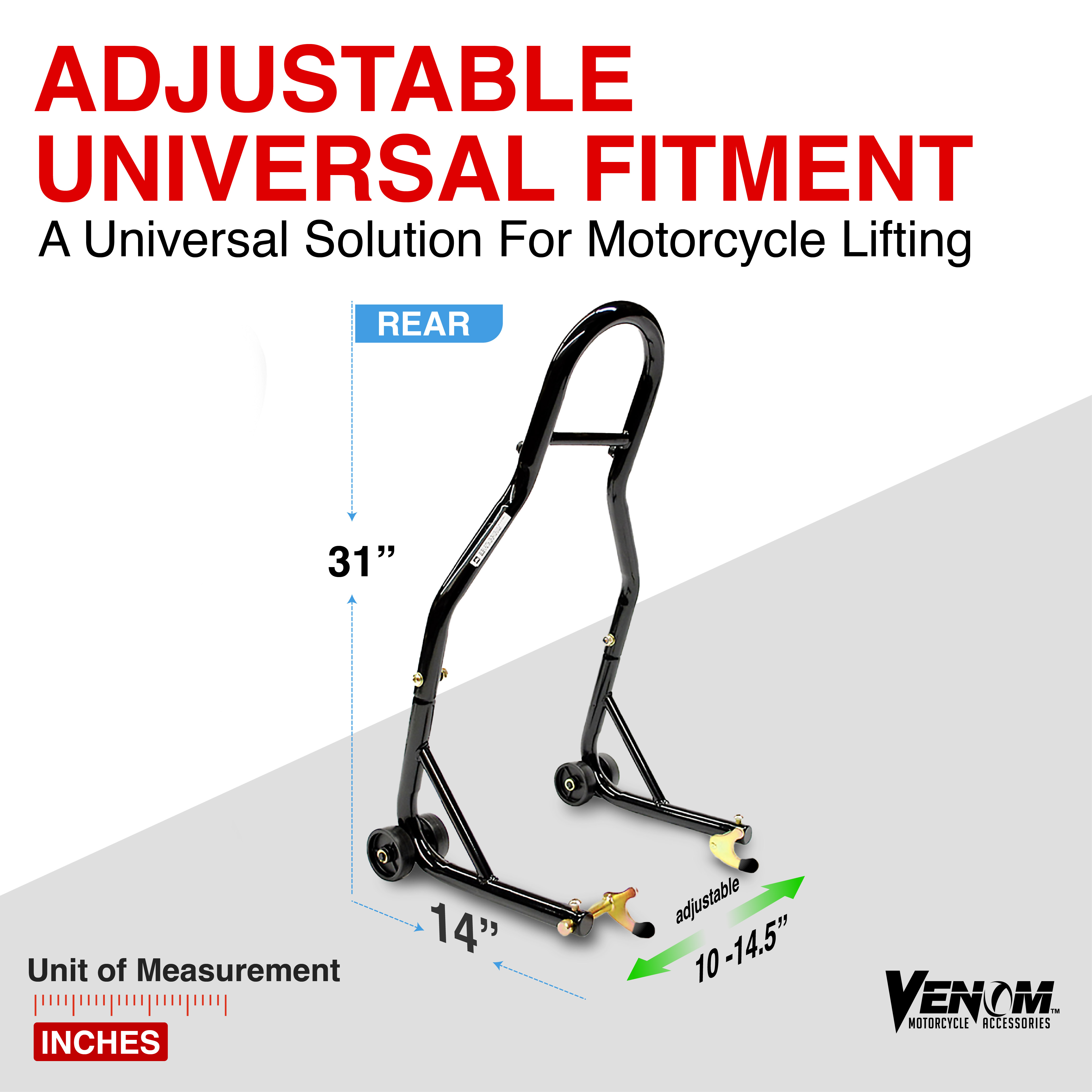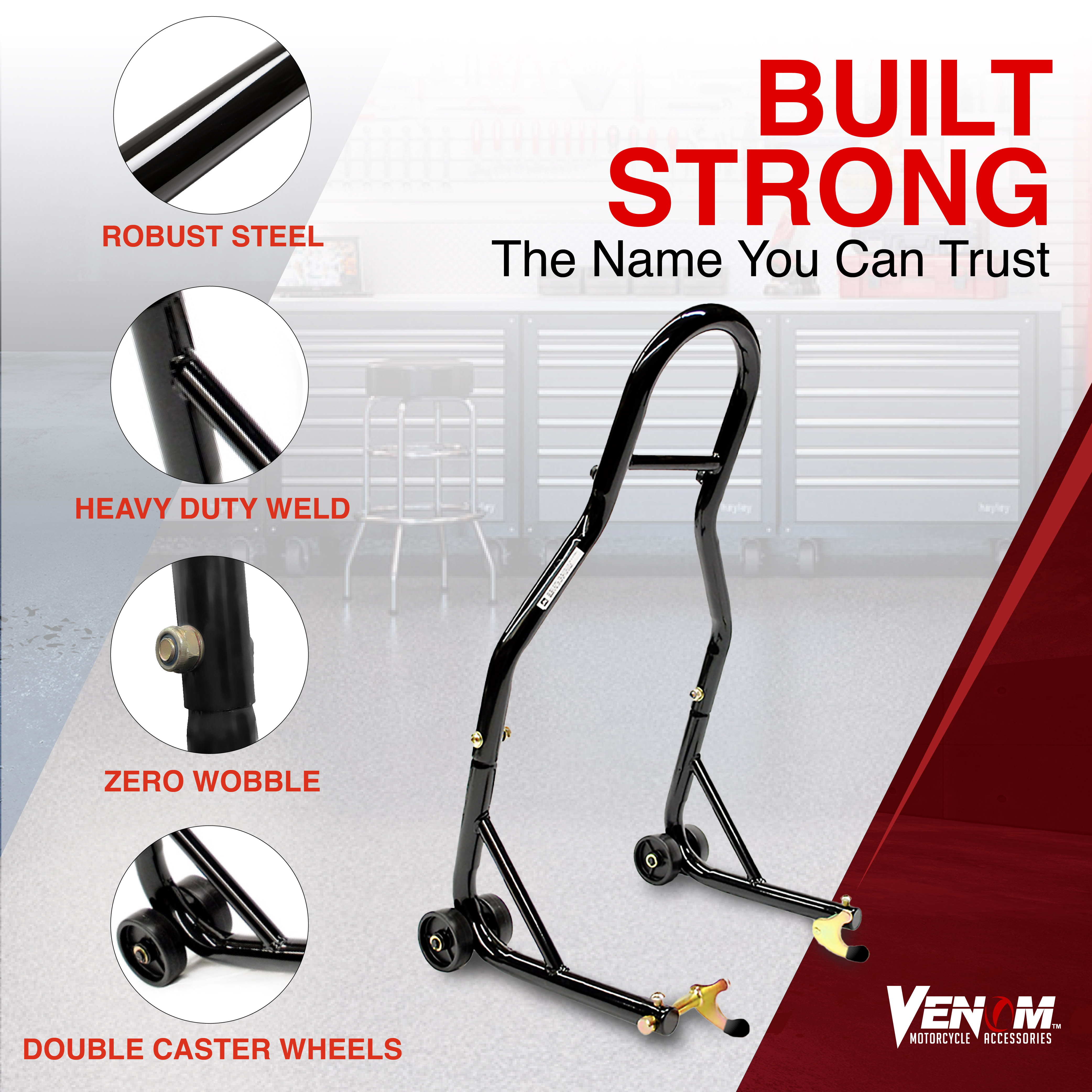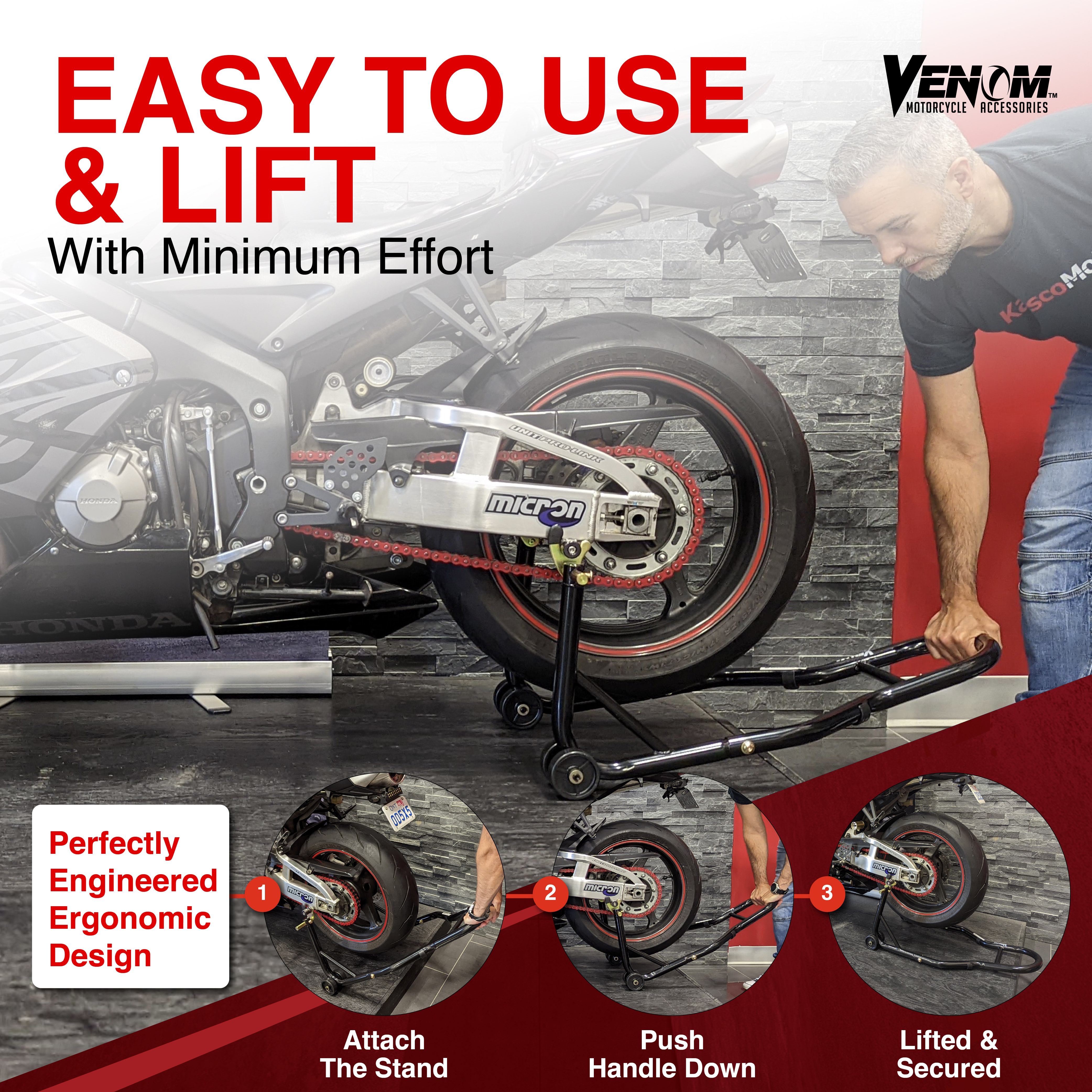 | The rear spool lift stand is made of extra heavy duty steel construction for a long life, strength and durability. What makes this stand unique is what you don't see, the stand is engineered with a leverage ratio that makes it easy and simple to use. The rear spool lift stand allows easy and safe lifting of the rear wheel for for repair, maintenance, and storage. Stand is supplied with four wheels for stability in all sorts of terrain. Features: