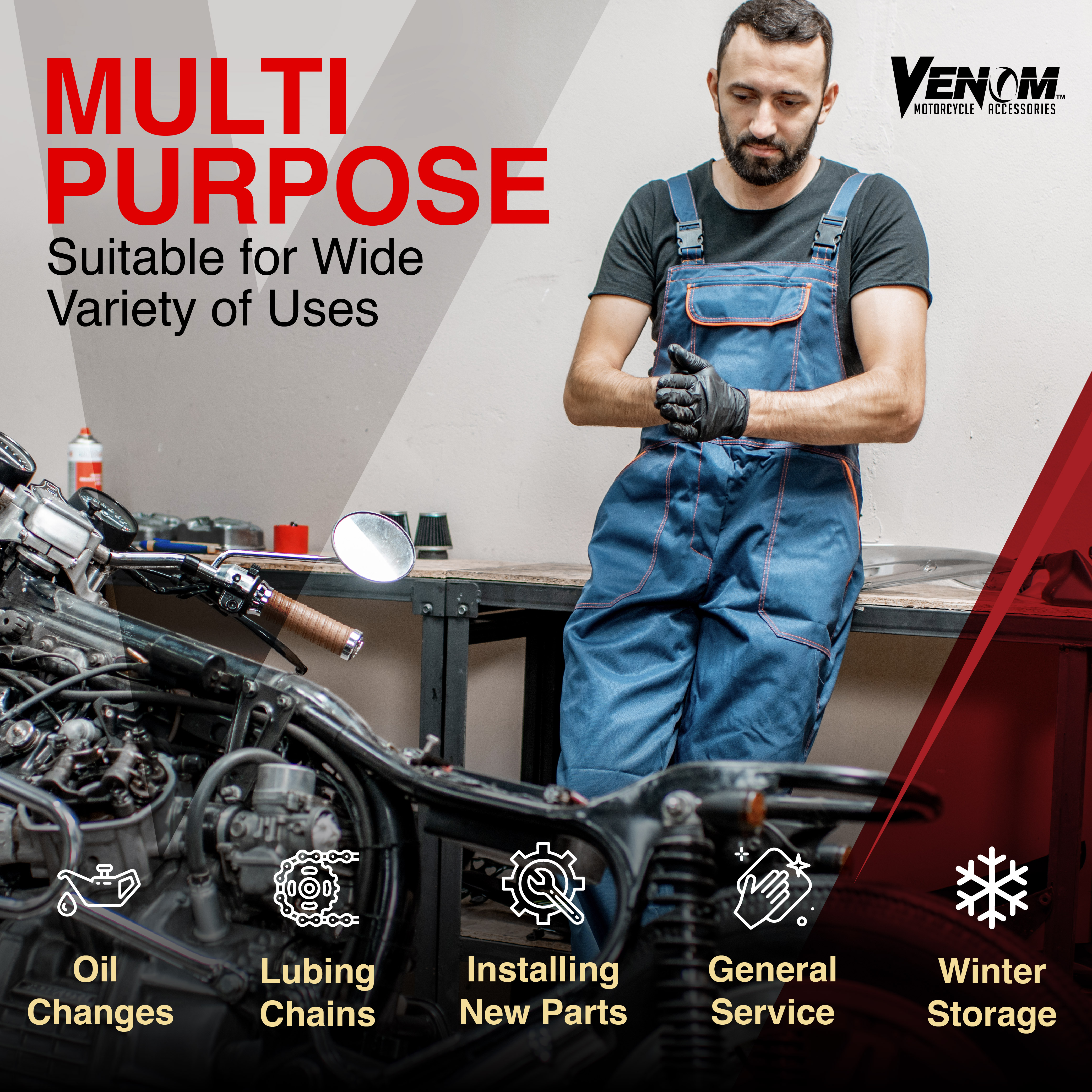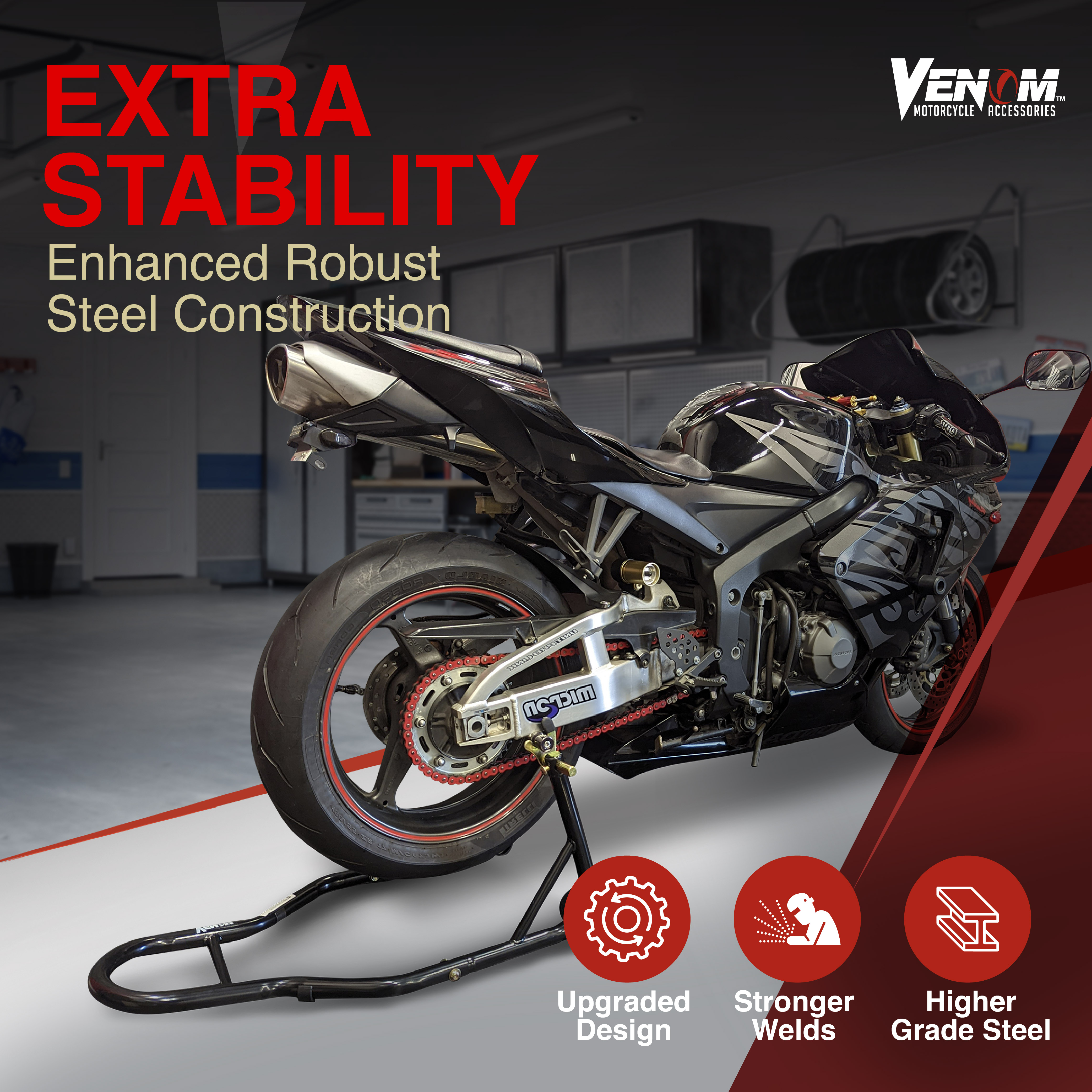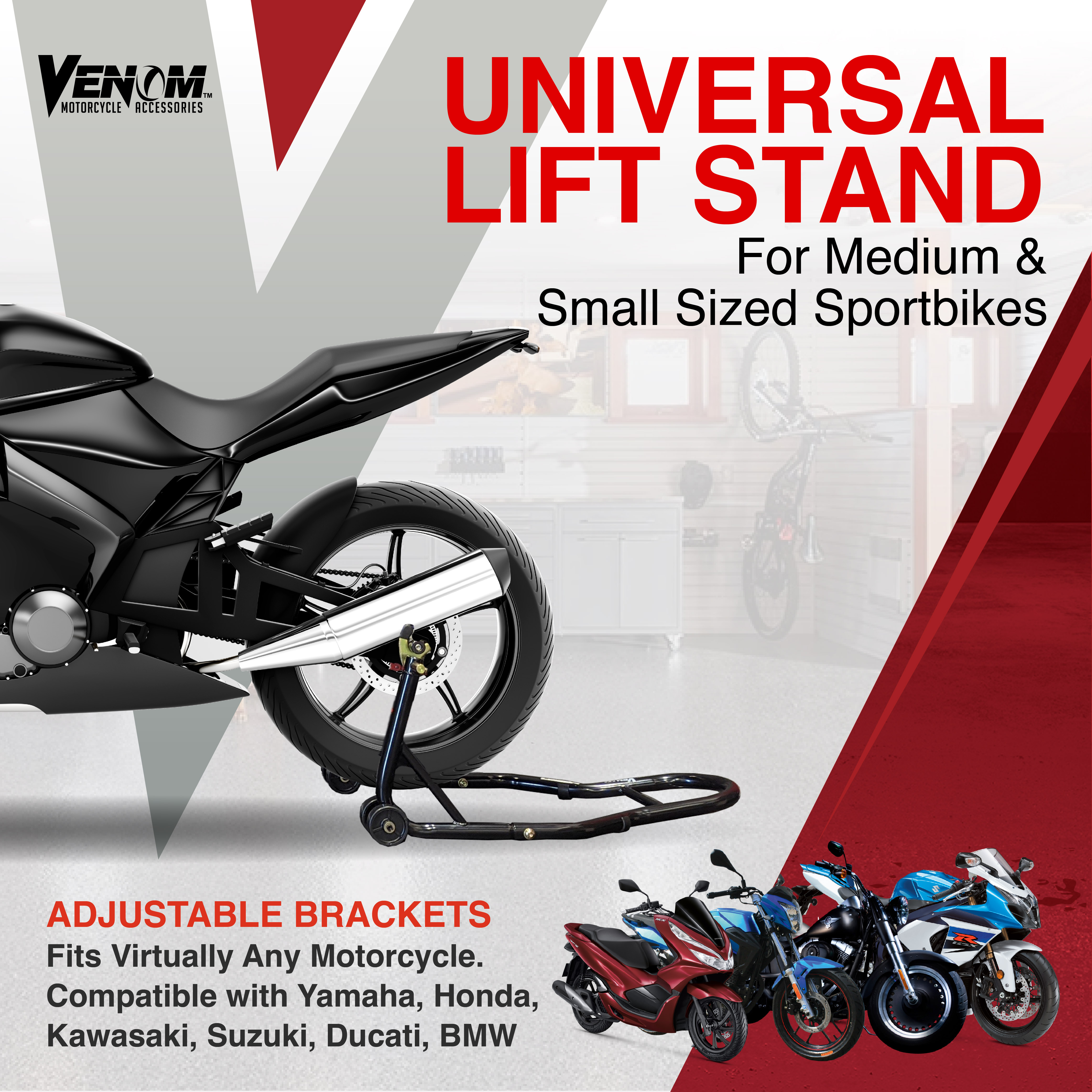 | The rear spool lift stand is made of extra heavy duty steel construction for a long life, strength and durability. What makes this stand unique is what you don't see, the stand is engineered with a leverage ratio that makes it easy and simple to use. The rear spool lift stand allows easy and safe lifting of the rear wheel for for repair, maintenance, and storage. Stand is supplied with four wheels for stability in all sorts of terrain. Features: