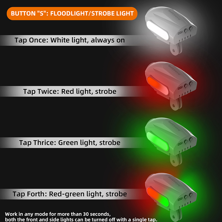 l Far-beam, floodlight, burst flash, SOS multi-function in one. Front far-fire searchlight, side white floodlight and red and green flash light, to adapt to the needs of different scenes