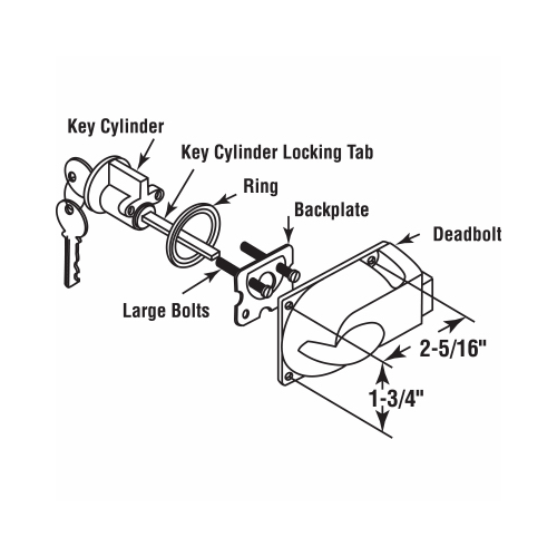 Diecast Painted Aluminum, Center Mount Deadbolt Lock with Keyed Cylinder. This is a painted diecast inside lock with heavy-duty steel spring bolt. The key cylinder has aluminum face and 5 pin tumbler lock with cylinder ring, and will replace most locking mechanisms of this type. The spring will put the deadbolt back into place unless the knob is turned 180 degrees and then it holds it in place.