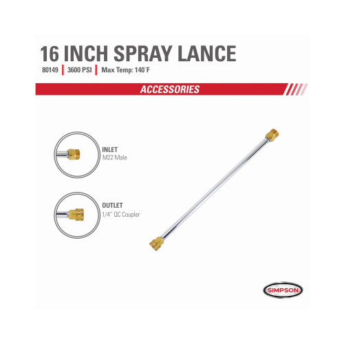"Simpson 16"" Spray Wand with maximum pressure rating of 3600 psi and 140 degrees fahrenheit. It has a M22 male inlet connector for gun and 1/4"" quick connect coupler for nozzle. It comes with a 90 day limited warranty."