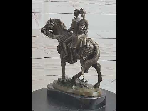 Witness the beauty and elegance of love with this exquisite bronze sculpture titled "Elegant Bride and Groom on Horse Back" by the talented artist Milo. This stunning piece captures the essence of a bride holding a bouquet of flowers as she sits gracefully on a horse, accompanied by her dashing groom.