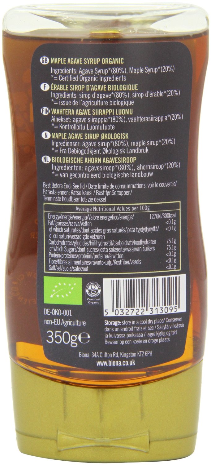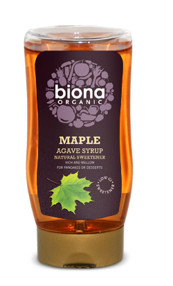 Biona Organic Maple Agave Syrup is made with 20 percent pure maple syrup. A rich and mellow. Delicious syrup perfect for adding to your favourite dessert, pancakes, smoothies or ice cream. Also can be used in making cake and other baking recipes This vegan friendly syrup is sourced from the Mexican agave plant and is sweeter than honey, tending to be less viscous.