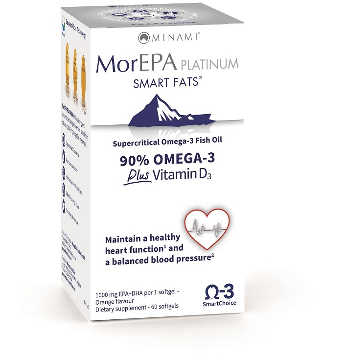 Minami MorEPA Platinum Smart Fats is a highly concentrated omega-3 food supplement that contributes rapidly to a balanced omega-3 index. It contributes to the normal function of the heart, maintenance of normal blood triglyceride concentrations and the maintenance of normal blood pressure. DHA contributes to the maintenance of a normal vision and a normal brain function. Vitamin D contributes to the maintenance of normal bones and supports the good functioning of the immune system and muscles. Available in a pack of 60 softgels.