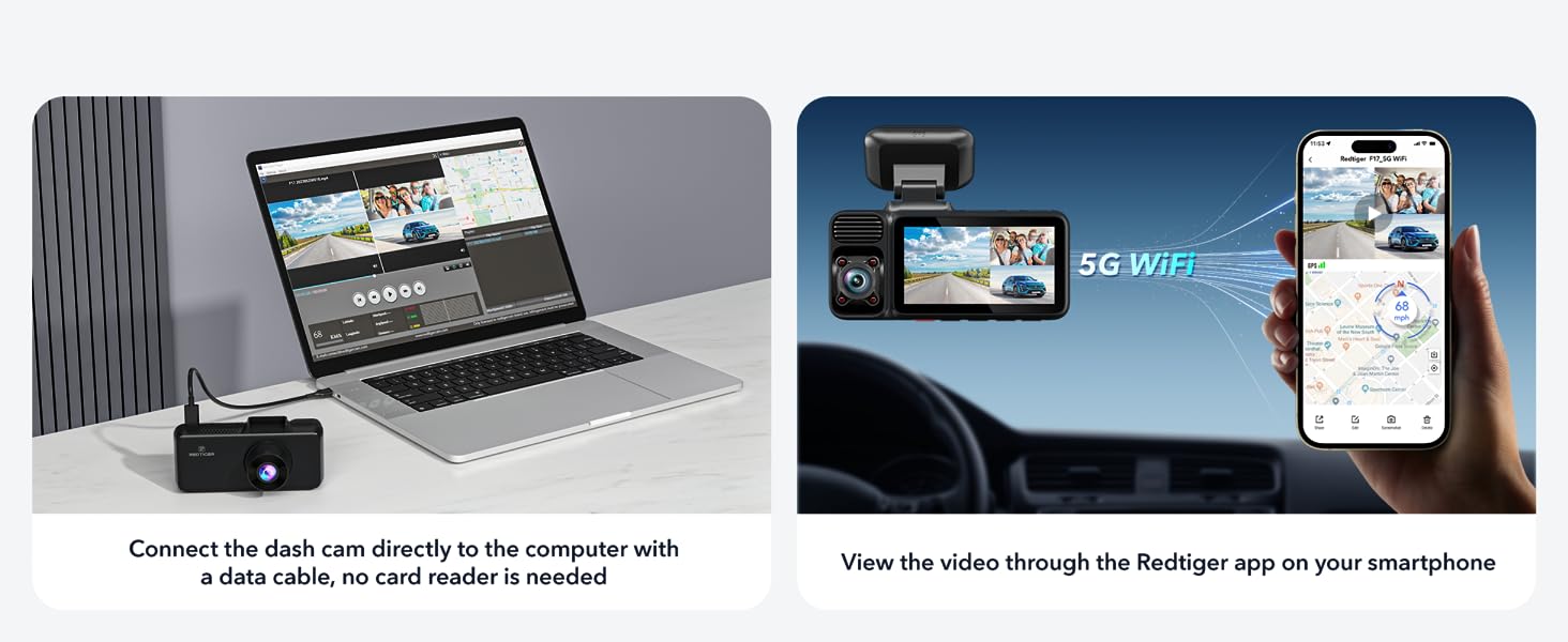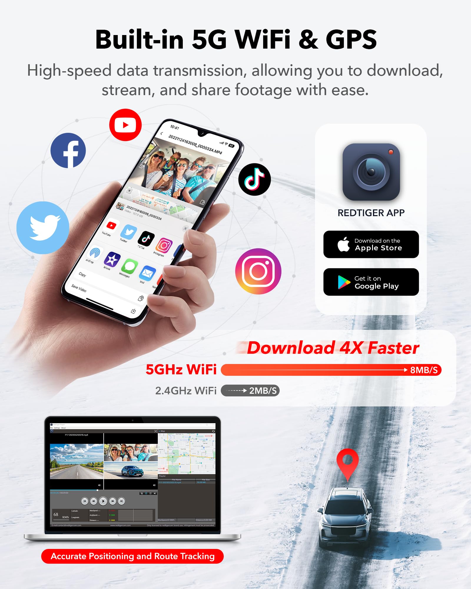 [Verbessertes, schnelleres 5G-WLAN und GPS] F17-Autokamera Bleiben Sie in Verbindung und verfolgen Sie Ihre Routen mühelos auf Ihrem Telefon über die „Redtiger“-App. Genießen Sie Hochgeschwindigkeitsdatenübertragung und teilen Sie ganz einfach Filmmaterial von unterwegs. Teilen Sie Filmmaterial und greifen Sie ganz einfach darauf zu. Spielen Sie drei Kanalvideos gleichzeitig ab und überprüfen Sie ganz einfach die Videometriken oder teilen Sie unerwartete Momente online.