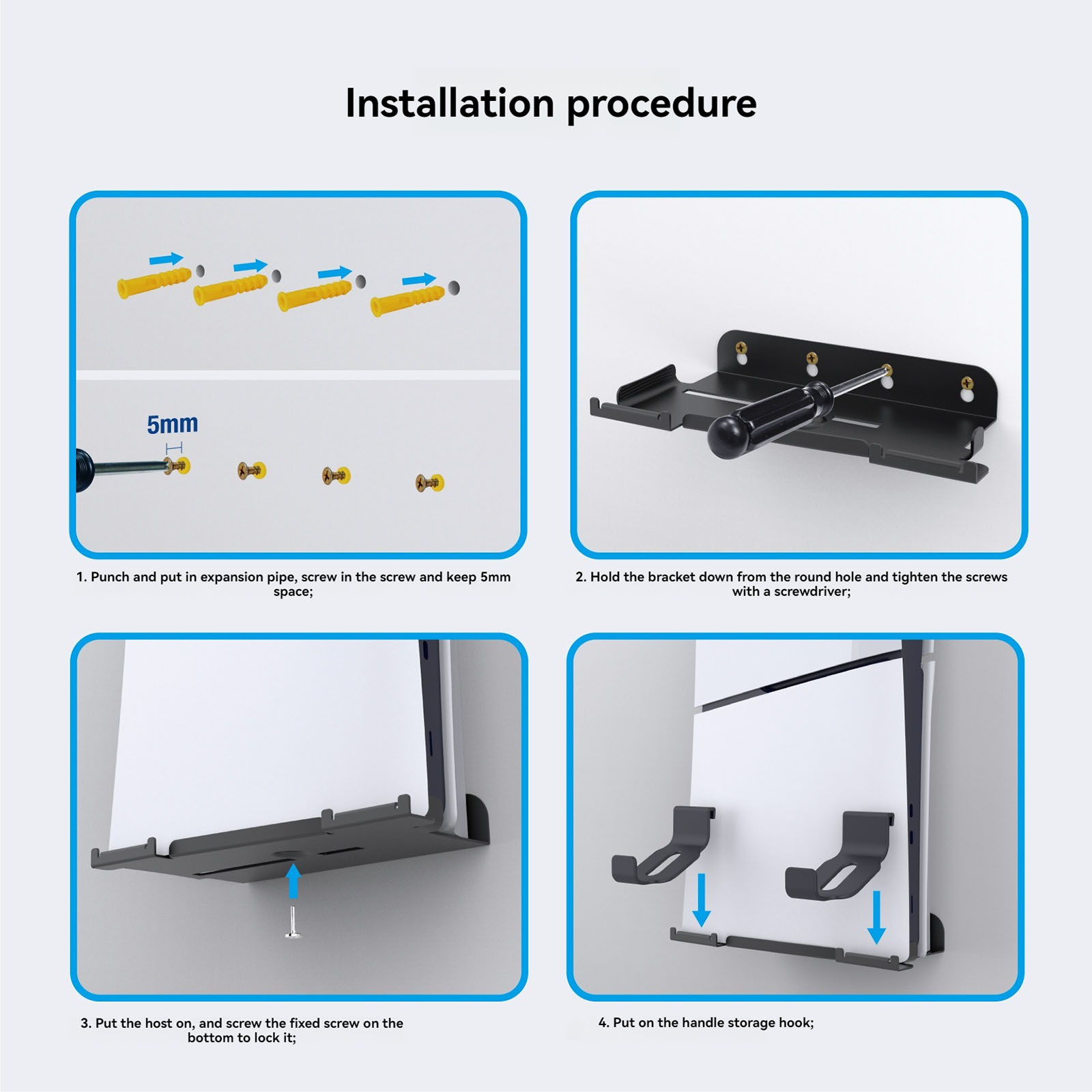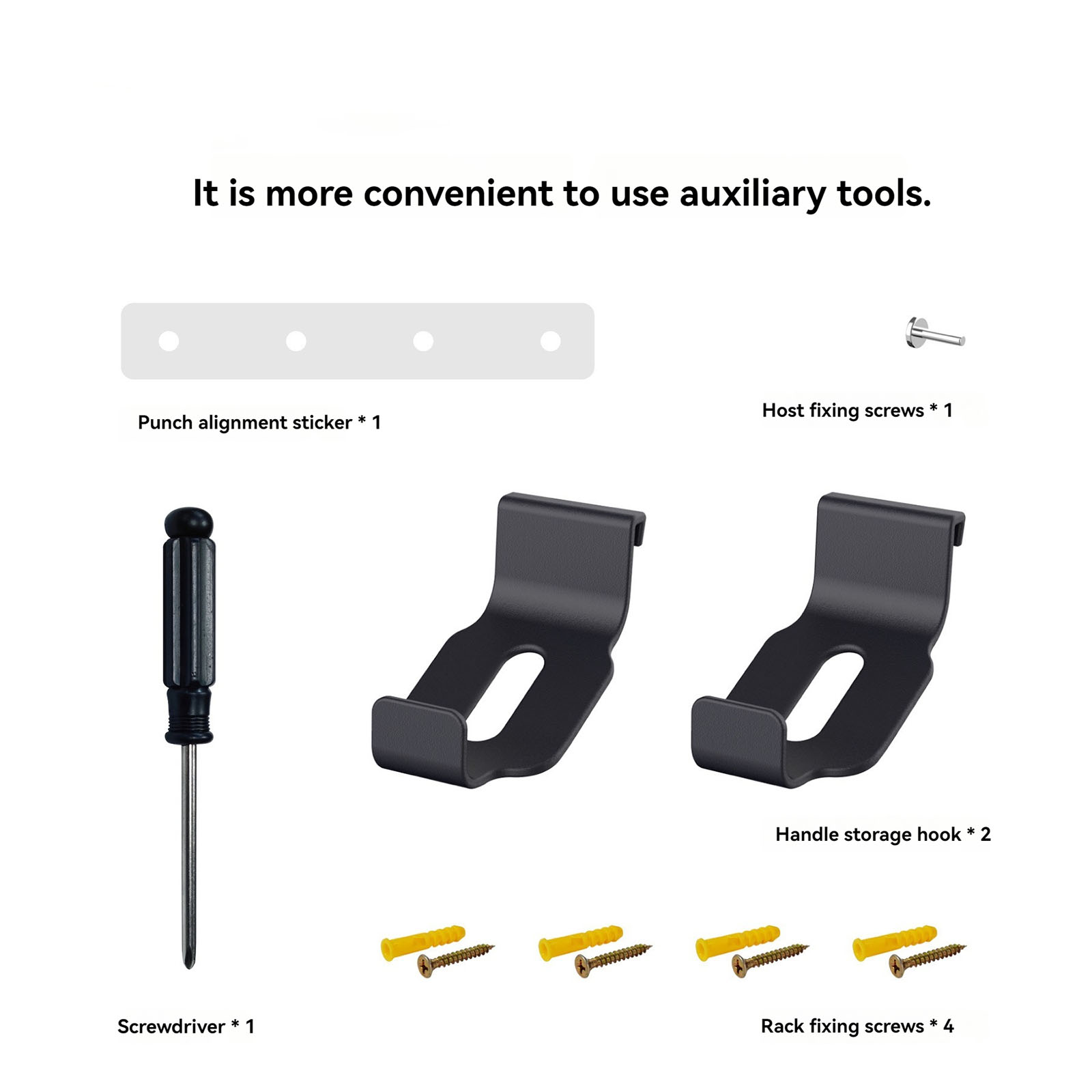 l 1x Perforated Alignment Sticker, 2x Handle Storage Hooks, 1x Screwdriver, 1x Host Fixing Screw, 4x Hanger Fixing Screws