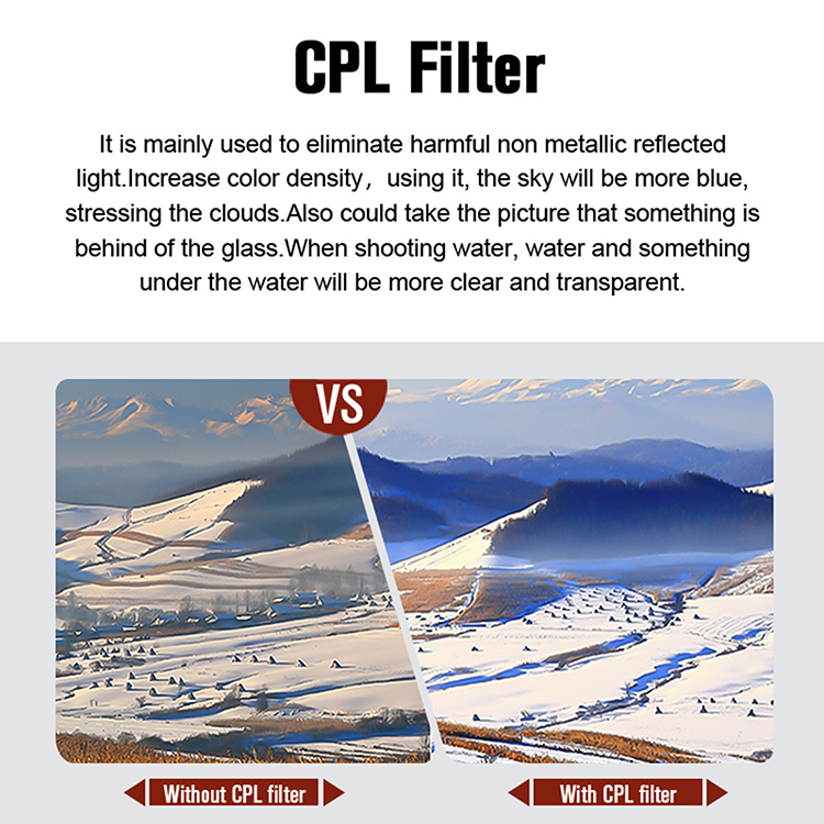 l CPL filter removes unwanted reflections from non-metallic surfaces such as water or glass and glare from the sun. Increases color saturation, creating deep, rich scenic images. Helps to reduce the amount of light entering the lens. Especially useful in reflective or stray light