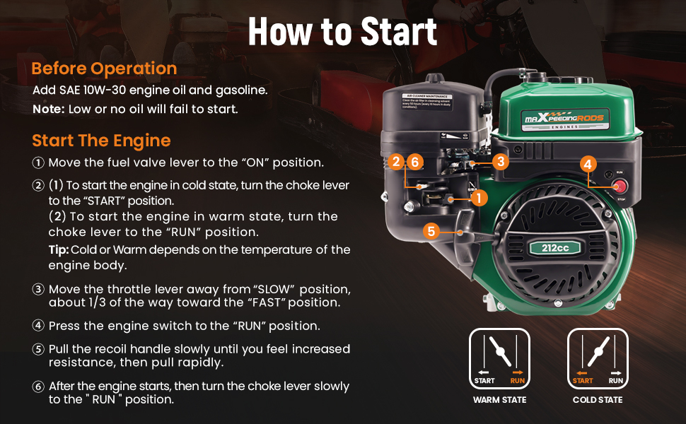 2. All engine functionally tested in the factory and may contain minimum residual oil or fuel odor, which is a normal phenomenon.
