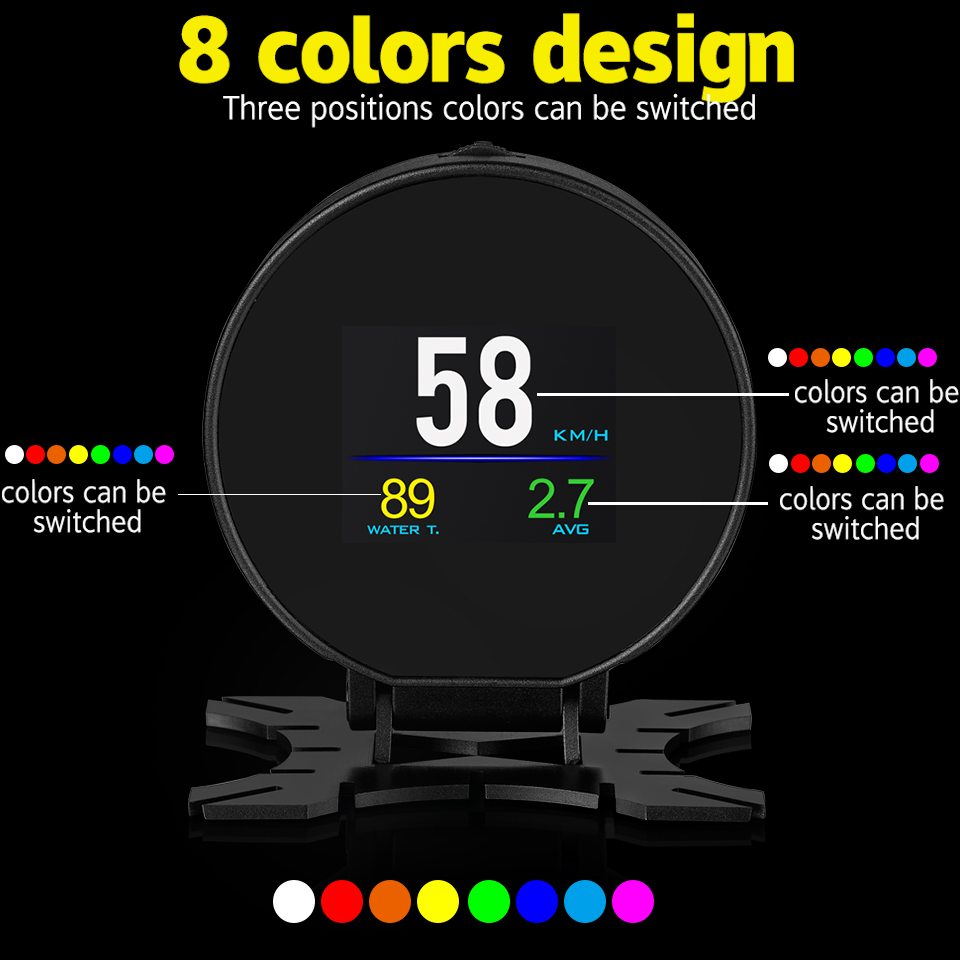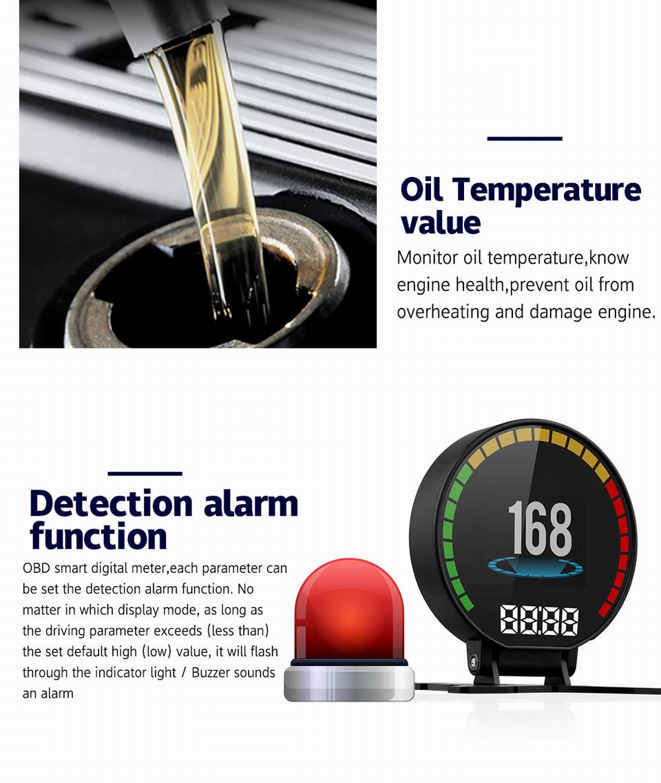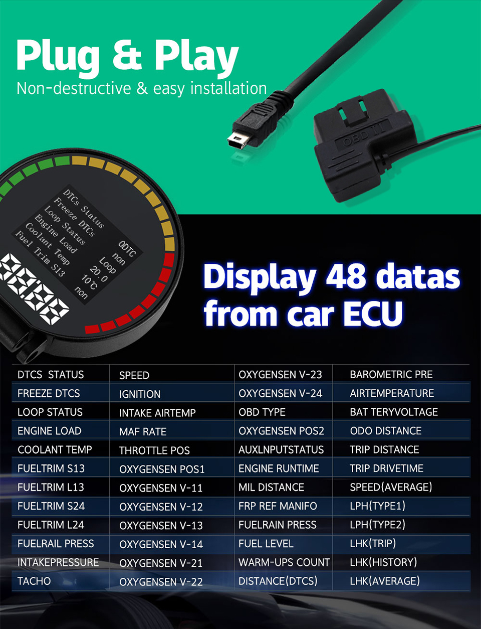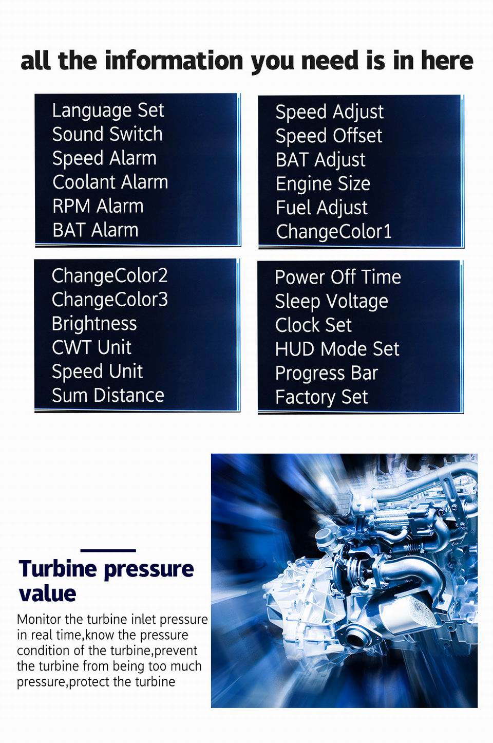 • Display Information:vehiclespeed, engine RPM, water temperature, voltage, instantaneous fuelconsumption, average fuel consumption, single driving distance,totaldriving distance, driving time,turbo pressure, Air/Fuel Ratio, oil temperature