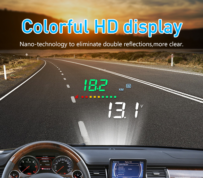 1、Available for any car,easy to install,plug and play 2、Screen 3.5'' HD display 3、Multi-color design makes the screen more abundant and easier to read 4、Nano-technology to eliminate double reflections,more clear 5、Rich Contents:speed,compass,,single driving time and distance,local time,statellite number,altitude,speed alarm,free switch between km and miles 6、Auto power on/off:HUD start and off with vehicle started and shutdown,effective protection of the car battery, retaining the manual switch mode, more easy to control HUD 7、Automatic and manual brightness adjustment mode,driving without glare