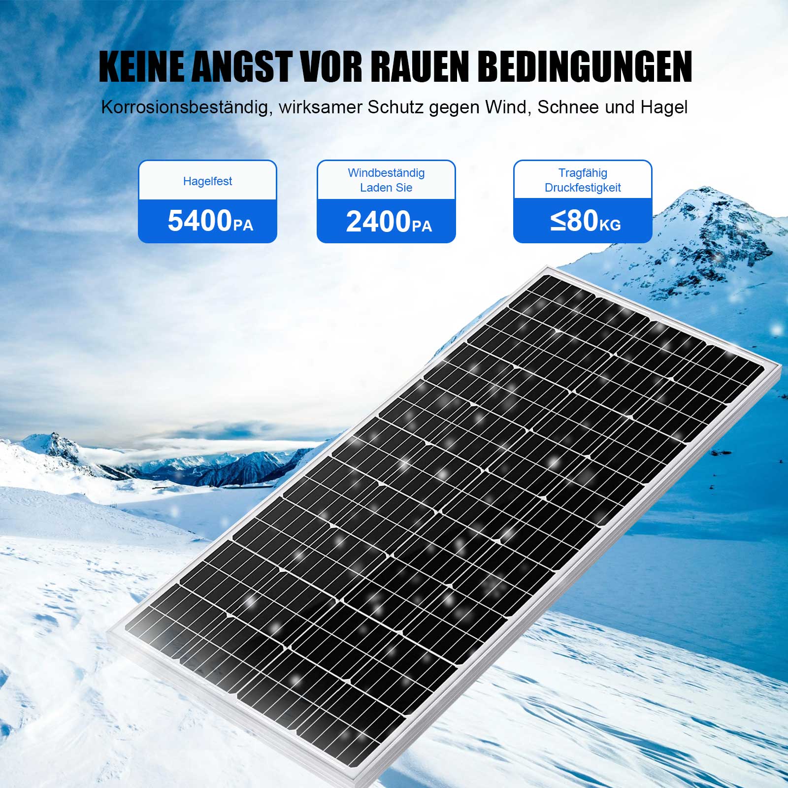 - Das Solarpanel besteht aus hocheffizienten monokristallinen Solarmodulen, einem hochbelastbaren Rahmen aus eloxiertem
