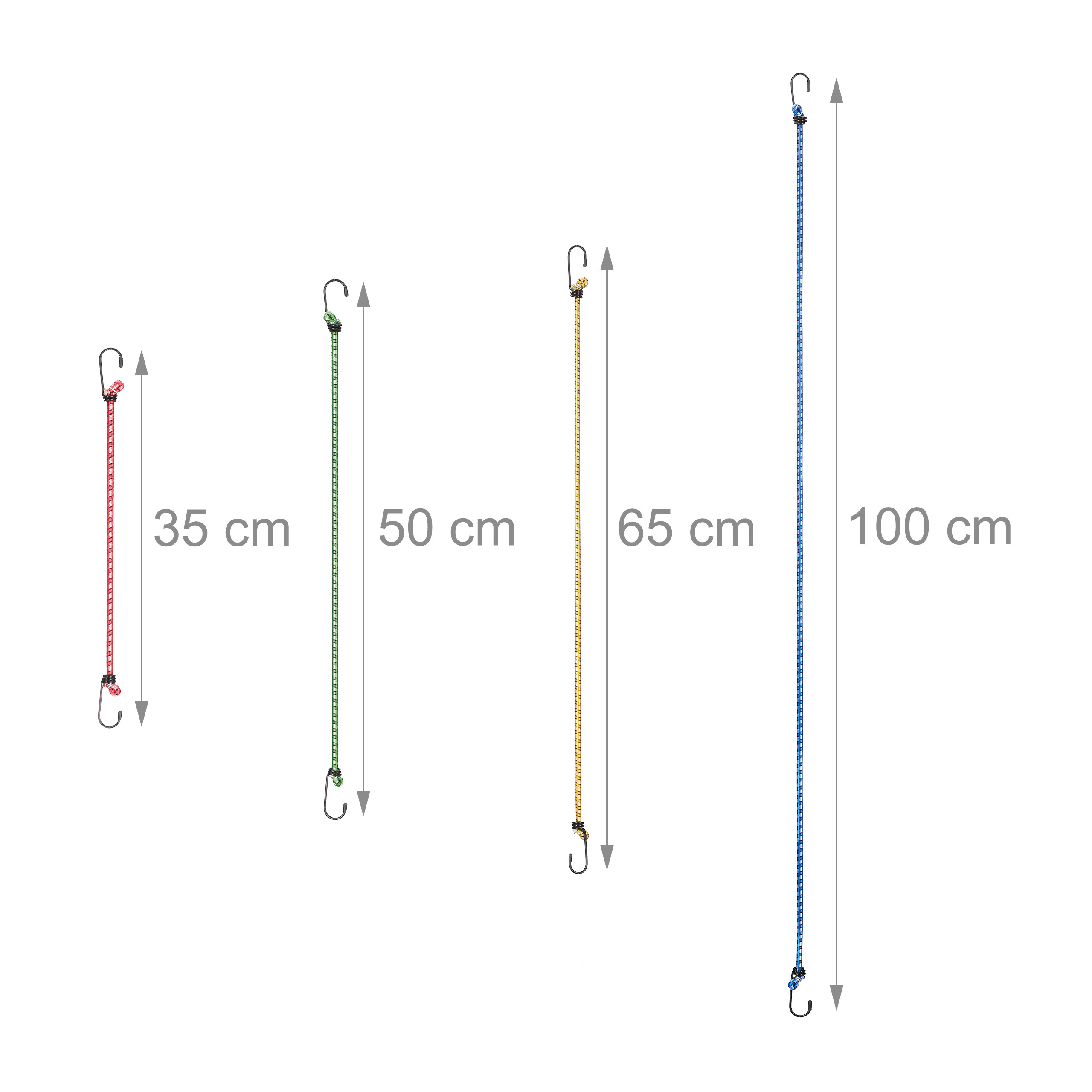 - Material: 1m, 65cm, 50cm und 35cm lange Gepäckspanner aus elastischem und widerstandsfähigem Material