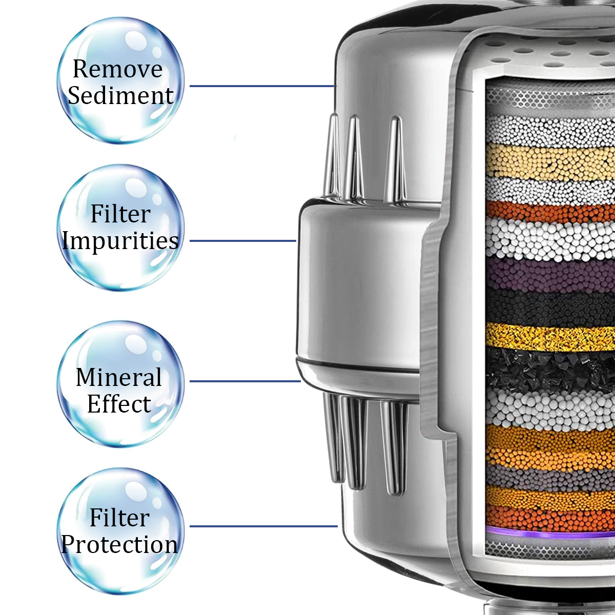 20-Stage Filtration: KDF 55, Alkaline Ceramic Balls, Activated carbon, Calcium Sulfite and other filtering materials ensures best effect of water quality purification. 20 Stages filter materials can effectively reduce chlorine, heavy metals, rust, sand and other sediments.