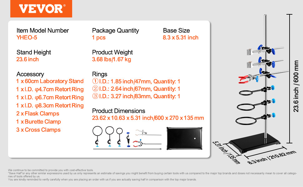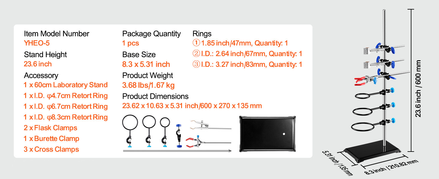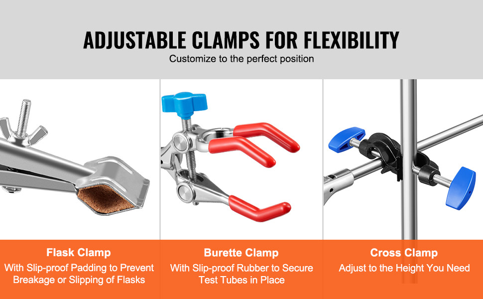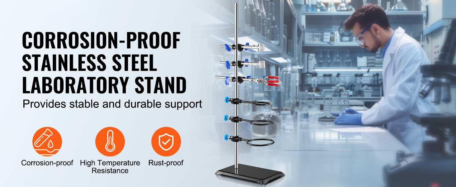 Crafted from stainless steel and cast iron, our support stand withstands high temperatures and corrosion for long-term use. Featuring multiple adjustable clamps and retort rings, it meets your diverse needs. It excels in filtration, heating, and titration experiments.