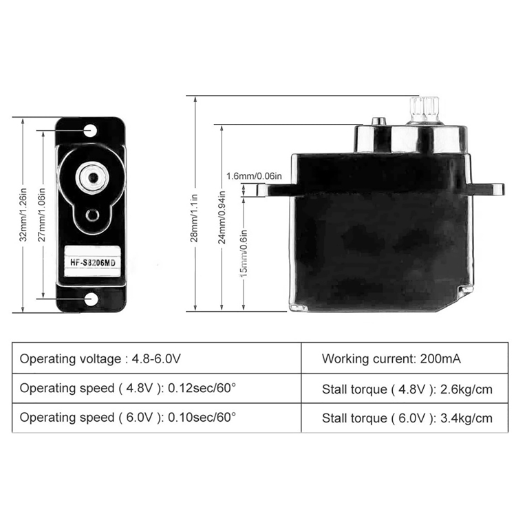 l Speed: 0.12sec/60° at 4.8V; 0.10sec/60°at 6V