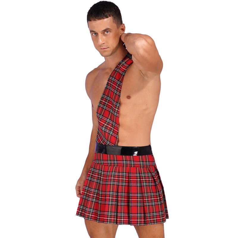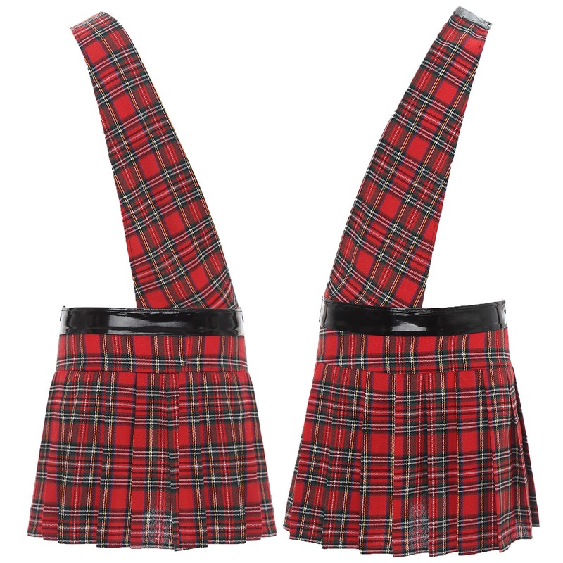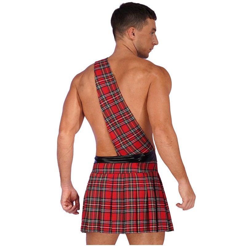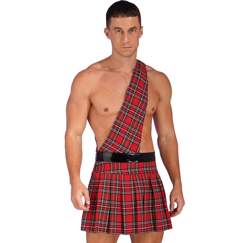 Men’s pleated skirt with one shoulder strap, plaid printed, side invisible zipper closure, easy to put on and take off.