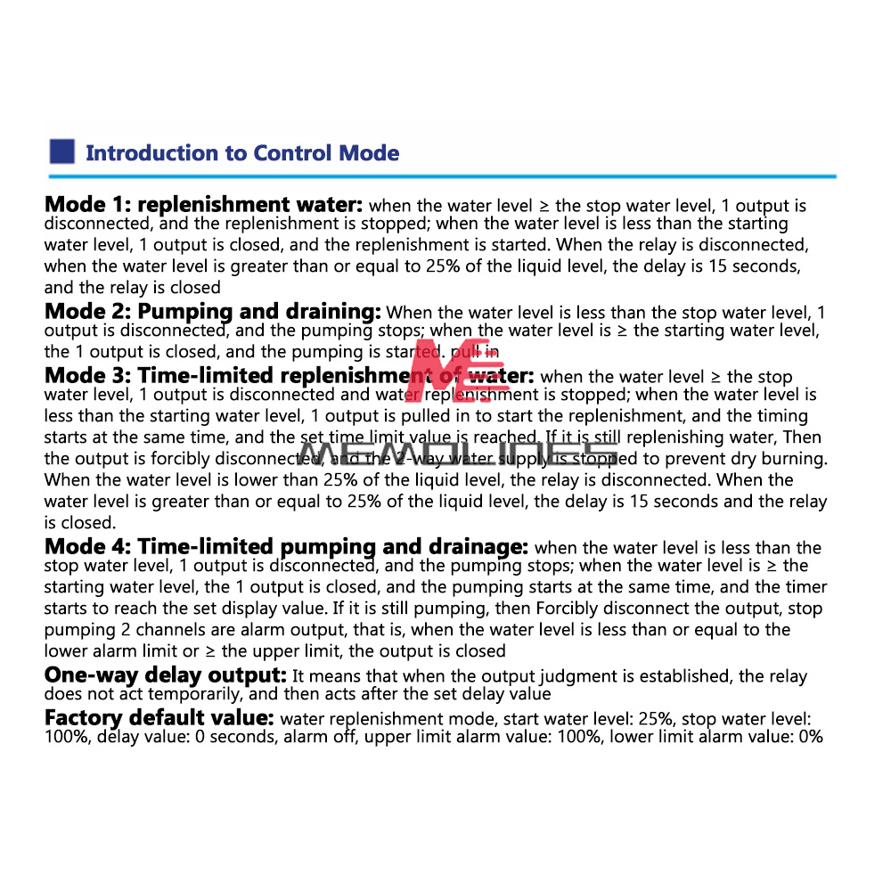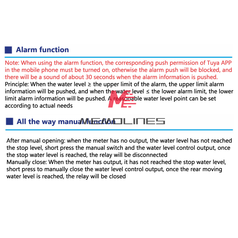 4. The on-off of one output can be controlled remotely or manually on site (when the set water level value is not reached)