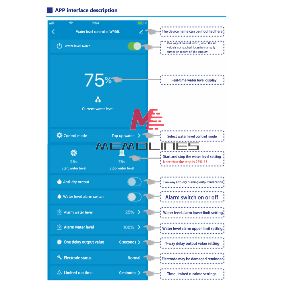 7. APP can display the current water level, start water level, stop water level, upper and lower limit alarm water level