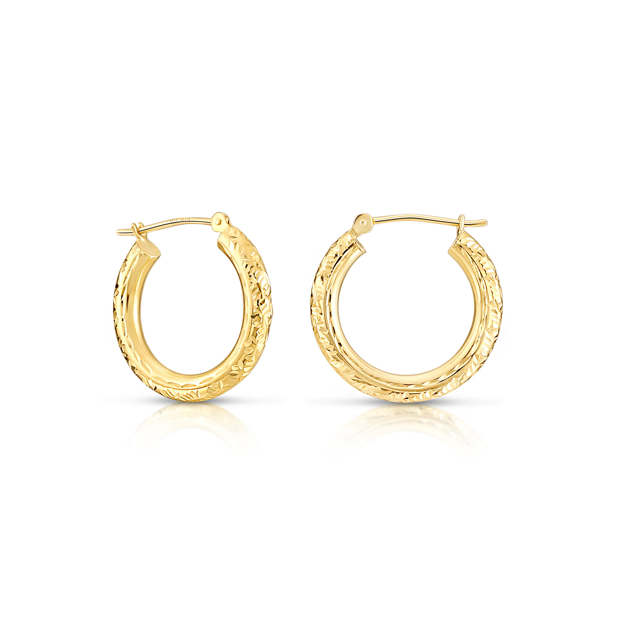 Genuine 14K Real Solid Gold Diamond-cut Round Hoops are one of a kind that will make sure you're the only one in the room with a pair. Forget about the boring, plain earrings and elevate your taste with something unique. Every cut on these gold hoops is hand-engraved and will guarantee shine in any lighting like a diamond. These perfect solid gold hoops are super lightweight for comfort, you can wear them on their own or stack them with different piercings to really make a bold statement and complete your look!