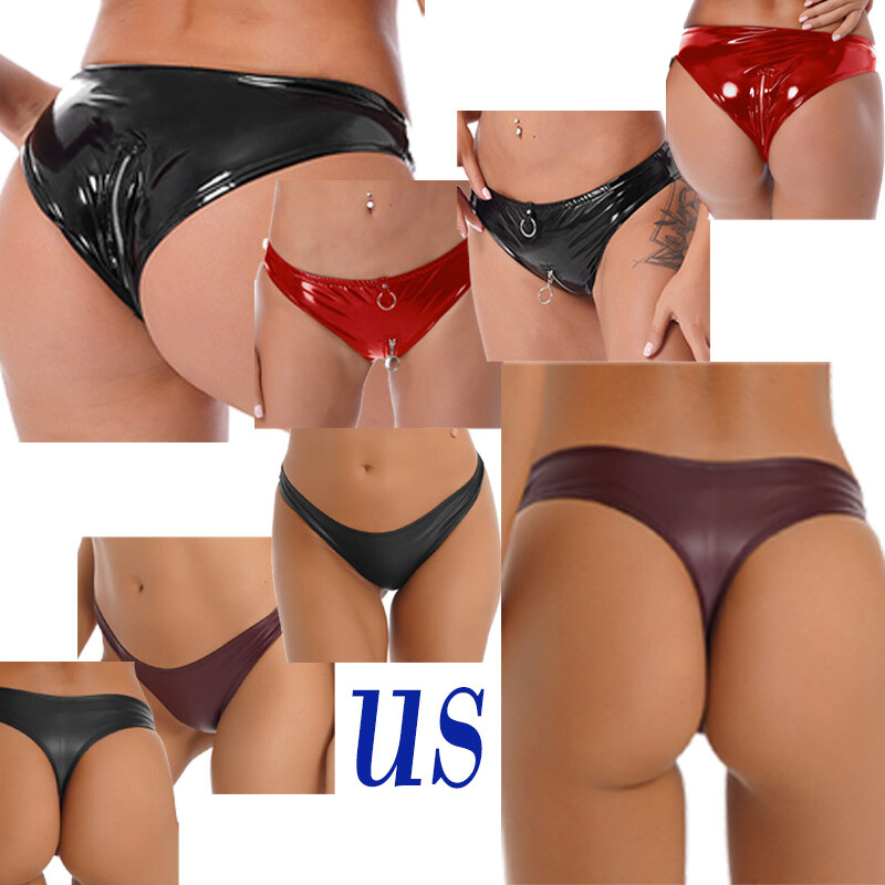 Womens Low Rise PU Leather Thong Underwear Solid Color Briefs Panties.