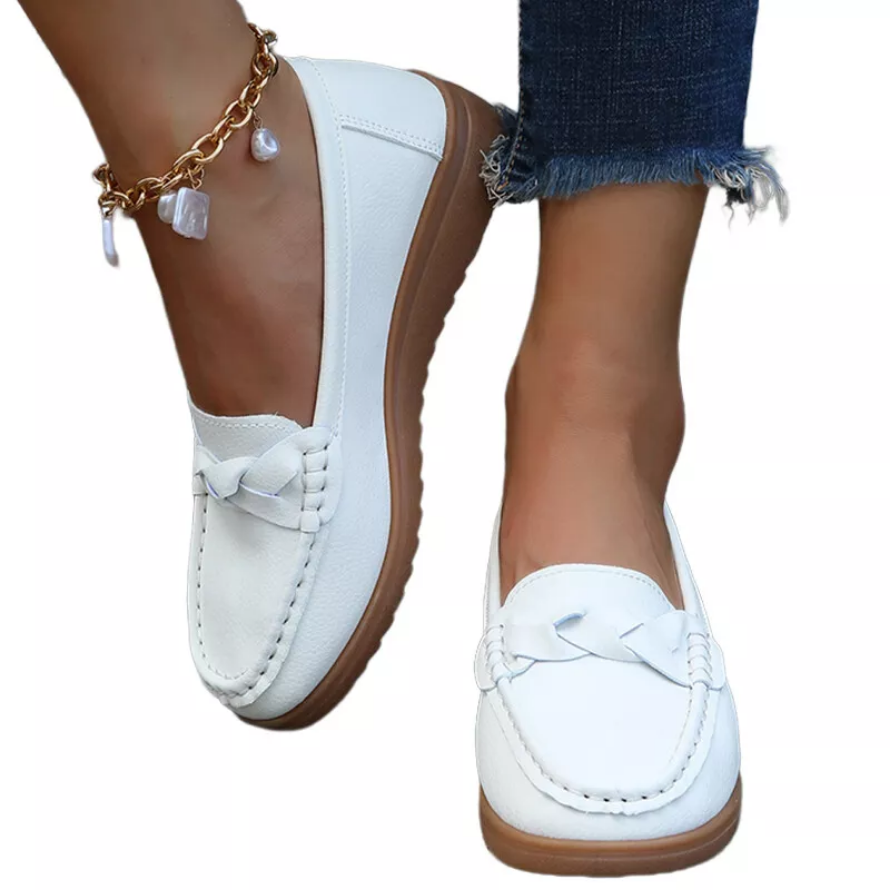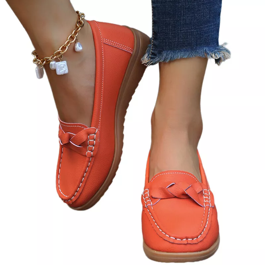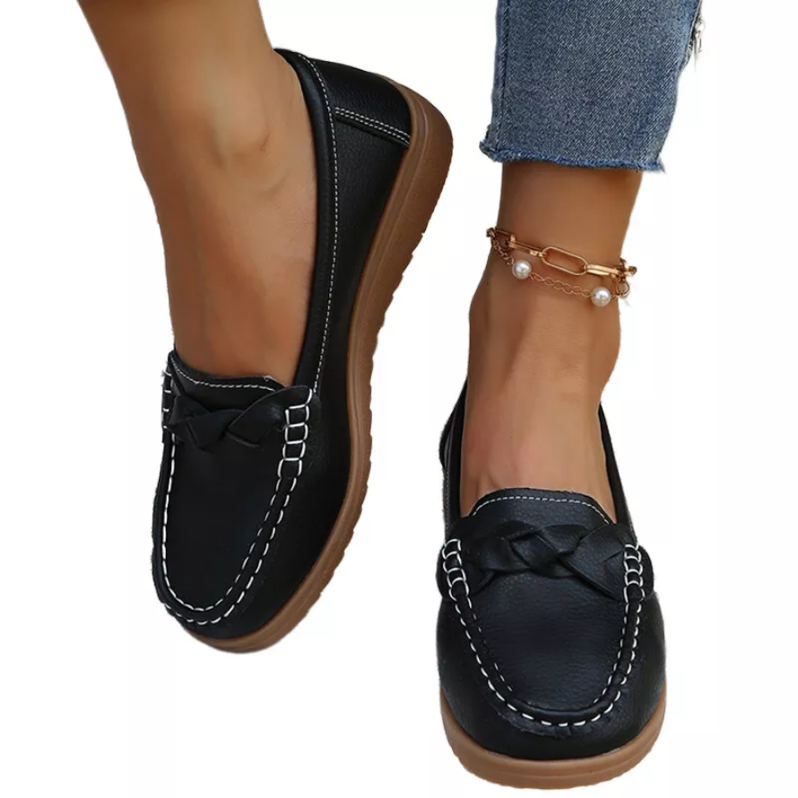 1. Comfortable and elastic faux leather material, the simple and generous plain upper with braid strap design shows the texture of the shoes.