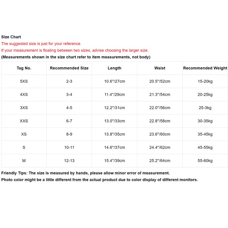 | Tag No. | Recommended Size | Length | Waist | Recommended Weight |