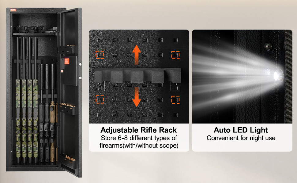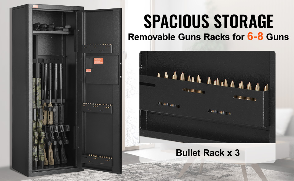 Large Rifle Gun Safe: Our gun safe can hold up to 6-8 rifles. The long gun rack is adjustable and detachable, providing even more flexibility and convenience. Includes 3 bullet cases to keep your firearms and accessories organized. Keep your guns easily accessible and secure.