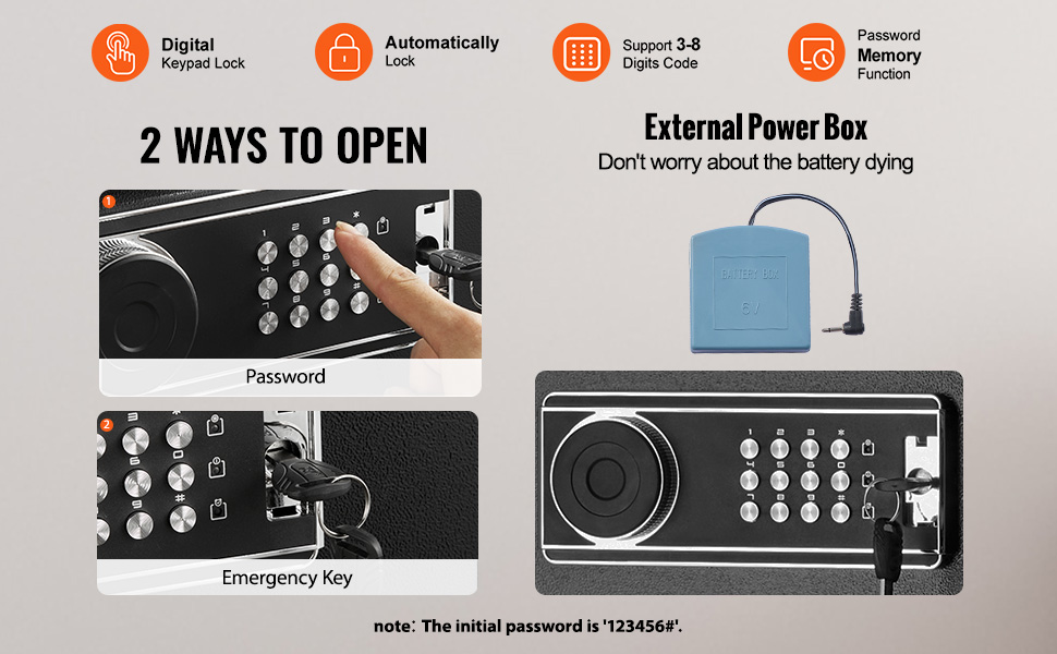 Smart Password Lock: The VEVOR tall gun safe features a smart 9-digit password lock. You can set 3-8 digit codes, and the lock automatically engages when the door is closed. The rifle safe also includes two emergency keys and an external battery box to ensure you're never locked out.