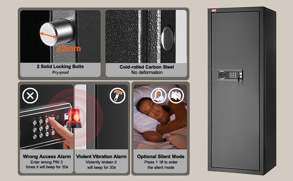 Alarm System & Silent Mode: Our gun safe for rifles is equipped with an advanced alarm system that activates a 30-second alarm if an incorrect password is entered five consecutive times. It will also sound an alarm in case of a violent impact. Plus, for discreet access, enter silent mode by pressing 11#.