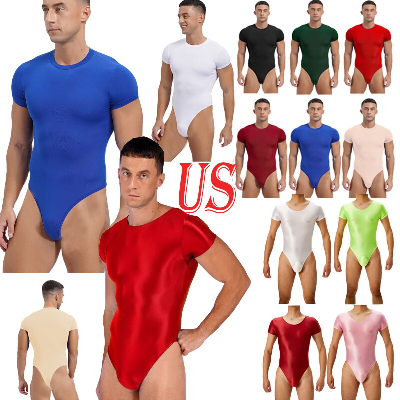 Glossy stretchy bodysuit for men, solid color, round neck, short sleeve, simple but stylish.