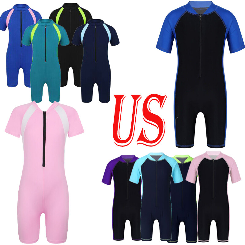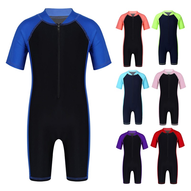 Kids Unisex Mock Neck Short Sleeves Colorblock Back Zipper Closure Swimming Jumpsuit.
