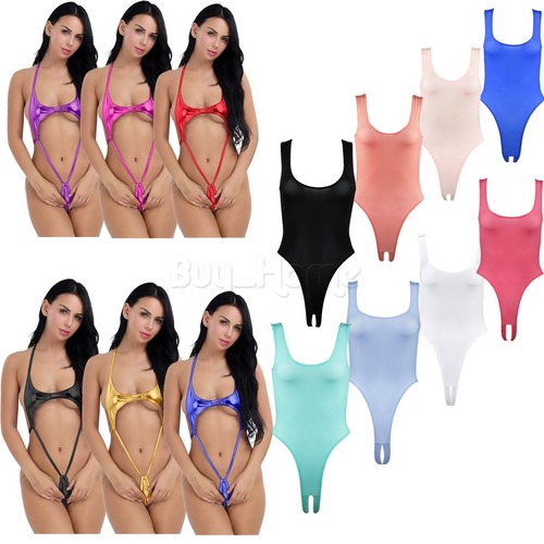 Sleeveless, open bust and high cut legs design, solid color, pull on closure.