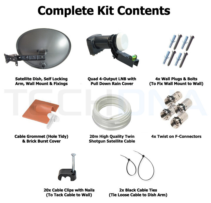 We have put together a Sky DIY installation kit which is perfect if you are looking to install a new dish or replace an existing one. The Quad 4-output LNB will allow you to connect up to four rooms/receivers to watch Sky or Freesat; or two rooms/receivers with twin inputs. All you need is a drill, hammer and an alignment meter to align the dish.