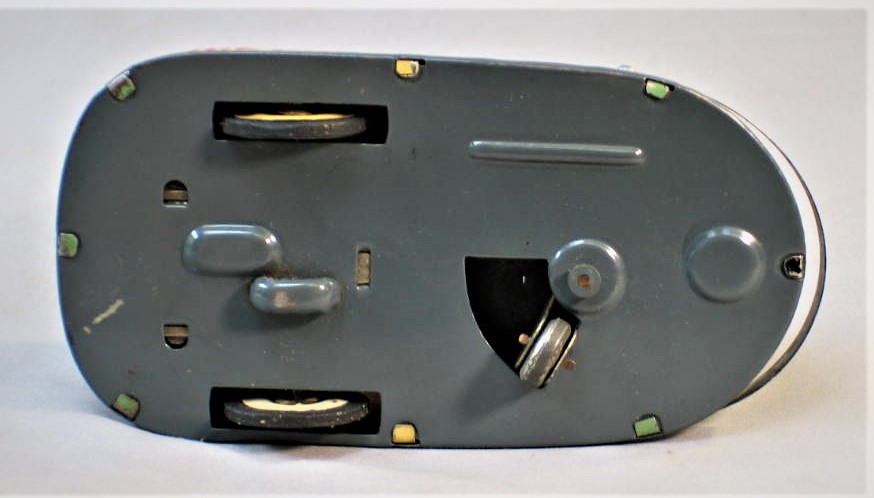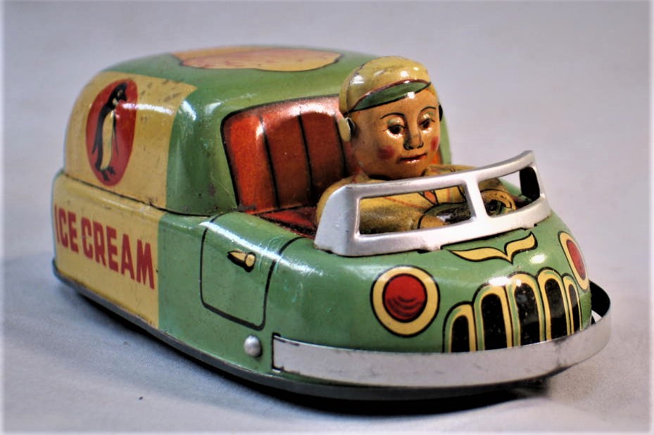 Vintage 1950's Tin Friction Ice Cream Truck -- Made in Japan... Tin friction ice cream delivery truck, with open front for driver, and can change direction when it hits a wall... Toy has lots of nice lithographed details including; ice cream cone on the roof, a penguin on both sides, and reads, "Ice Cream" on both sides and the back of the vehicle... Fine print logo on the drivers side door reads, "Trade Mark Modern Toys -- Japan"... Toy is in very good condition, some wear to the lithographed finish, please see photos for details... Toy Ice Cream car measures about 6" long... Truck with this same tin shape and size comes with a differant lithographed finish - the other ones being the "Magic Car No.2", and the "Marsman", although I think this is the rarest one of them....