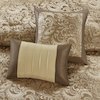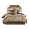 The Madison Park Essentials Brystol 24 Piece Room in a Bag provides a total makeover for your bedroom decor. This traditional comforter flaunts a brown, taupe, and gold jacquard paisley pattern with an accenting solid brown border to create a luxurious glam look. Matching pillow shams and solid soft gold Euro shams with 2-inch flanges coordinate beautifully with the elegant comforter. A solid brown bed skirt and 4 decorative pillows with embroidery and pleating details add the finishing touches to this paisley bedding set. Hypoallergenic polyester filling in the comforter and pillows contains no allergens and is treated to be dustproof. A 4 Piece sheet set is also included to complement the comforter and complete the jacquard bedding set. To elevate your bedroom, 4 solid soft gold window curtains with 2 paisley valances and 2 solid tiebacks are included to perfectly style your windows. Machine washable for easy care, this paisley comforter set may come in rolled or compressed packing and will need to be fluffed up. Use a steam iron to help remove wrinkles easier. Spot clean pillows.