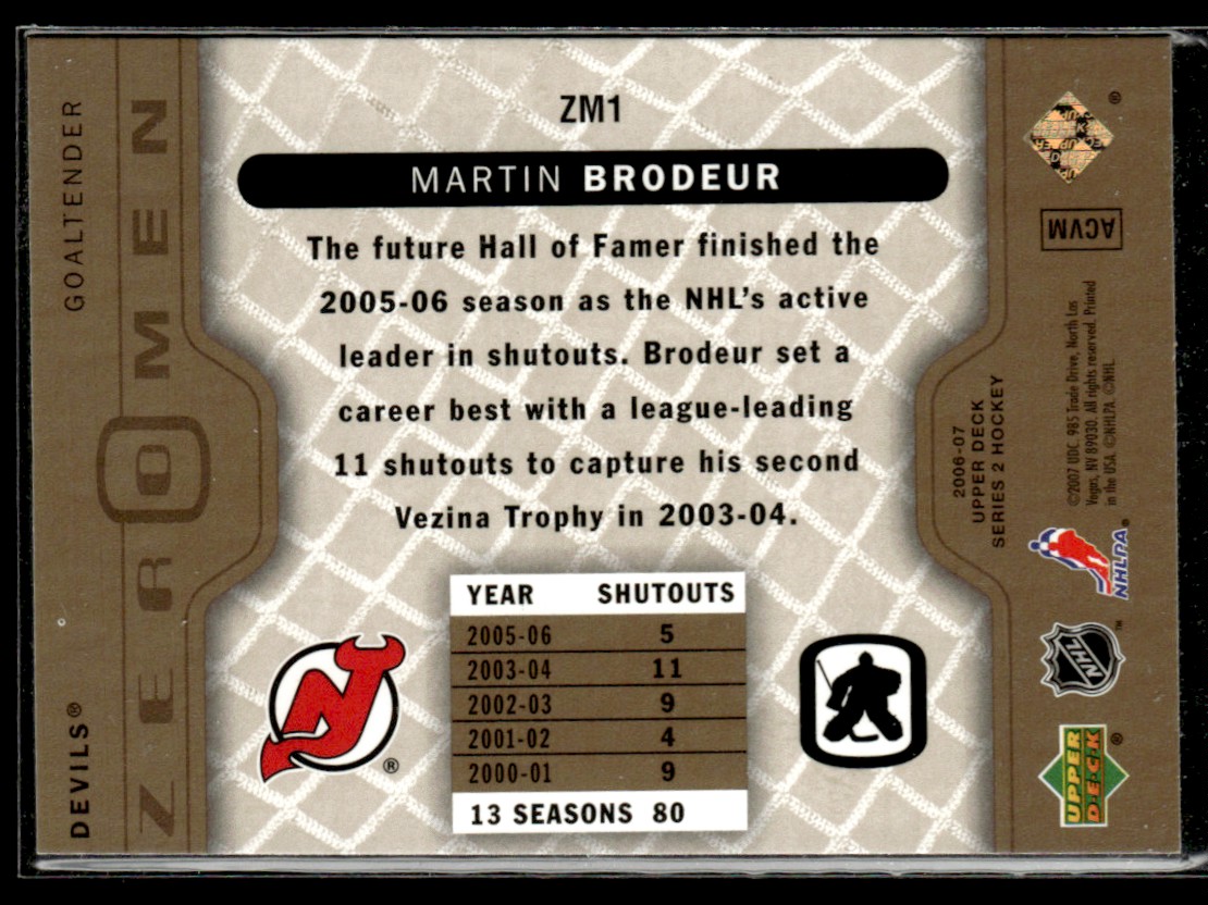 | 2006-07 Upper Deck Zero Men Martin Brodeur #ZM1 | ||||||||||||||||