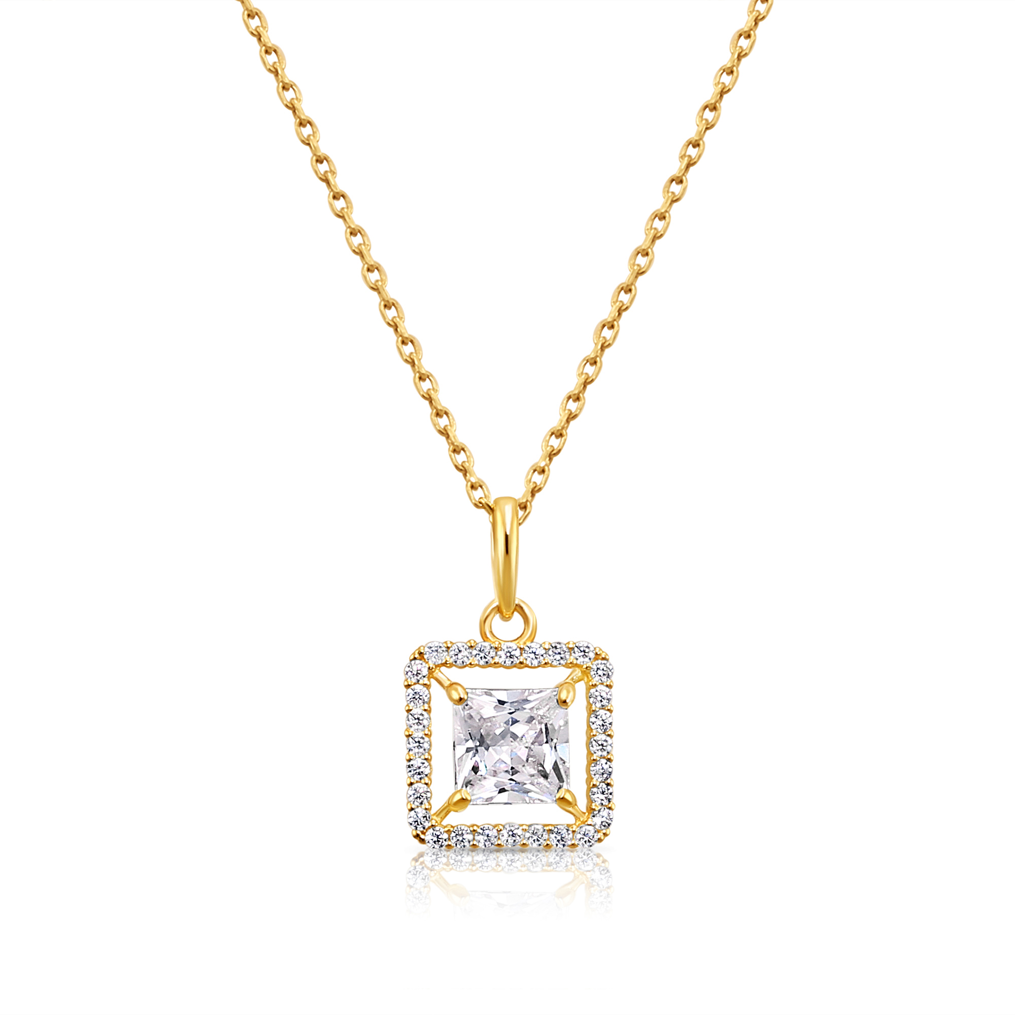 Our square halo pendant is handcrafted from 14K real solid gold, featuring a .71-carat princess-cut simulated diamond at its center to be full of shine and sparkle. The beautiful pendant is adorned with halo-set, dazzling, super clear white zirconia, which shimmers for extra shine like a diamond. Designed to be worn solo or layered with multiple different pendant charms for a bigger statement to complete your look!