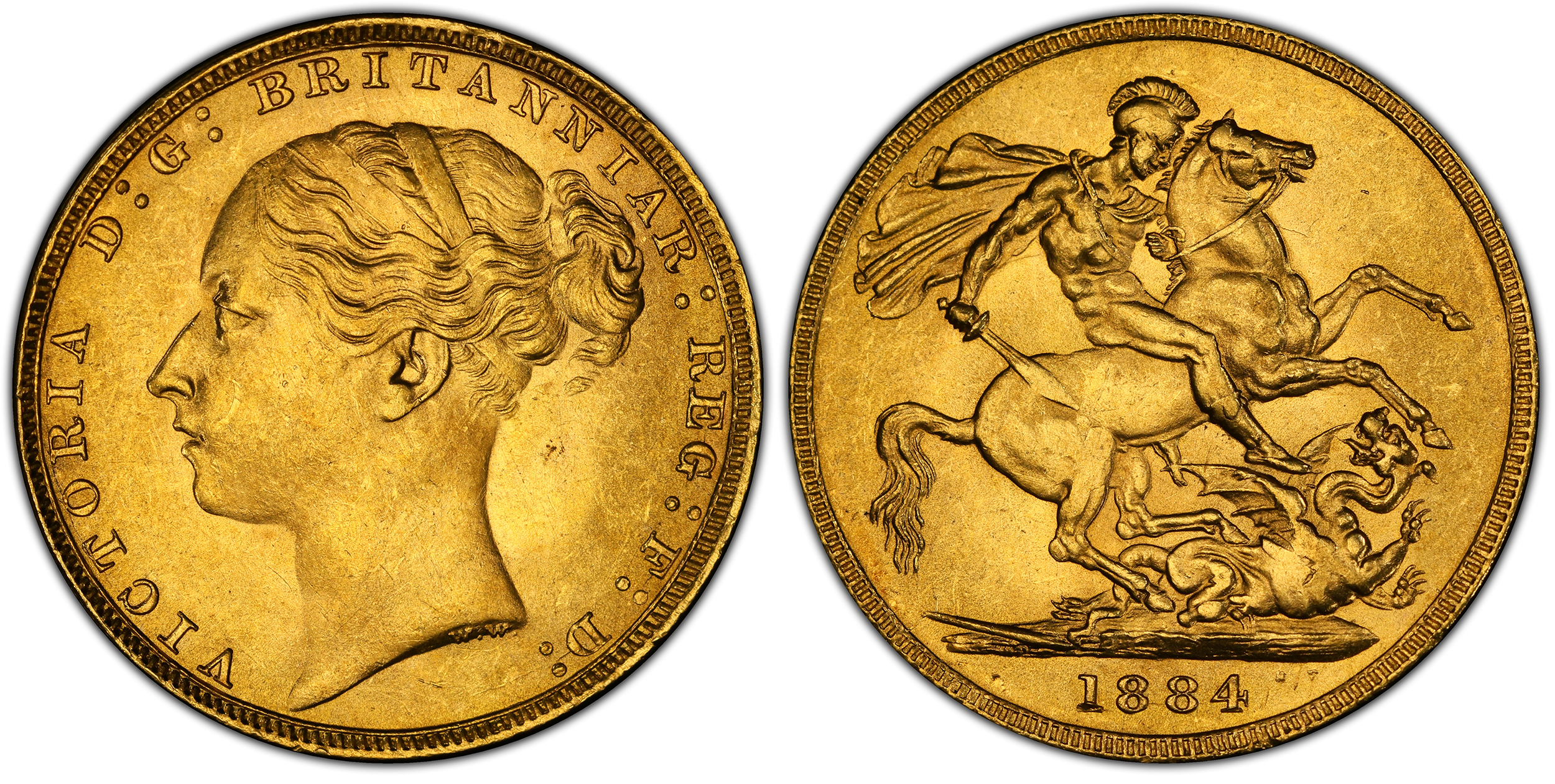 1079067 | GREAT BRITAIN. Victoria. (Queen, 1837-1901). 1884 AV Sovereign. PCGS MS64. VICTORIA D:G: BRITANNIAR: REG: F:D:. Head, left; initials W.W. clear on truncation / St. George slaying the dragon. KM 752; SCBC-3856F; Marsh 92A.