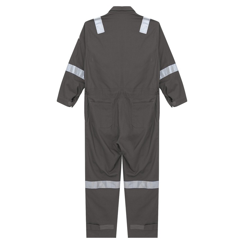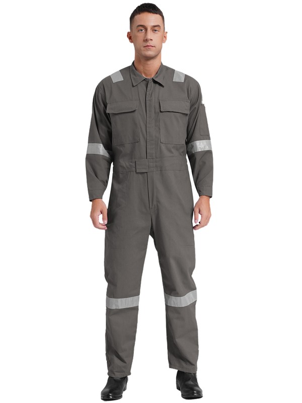 One-piece jumpsuit is designed with lapel, long sleeve, long pants, reflective strips, multiple pockets, front zipper and hook&loop fastener.