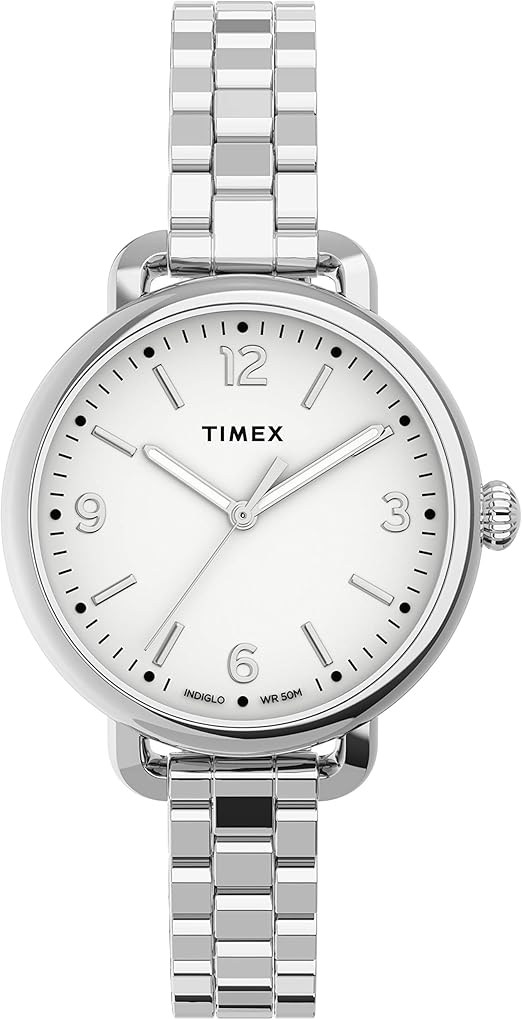 Silver-tone brass case and bracelet. Fixed stainless steel bezel. White dial and index-Arabic numeral hour markers. Minute markers around the outer rim. Dial Type- Analog. Quartz movement. Pull / push crown. Solid case back. Case size- 30 mm - case thickness- 9 mm. Band width- 10 mm. Fold over clasp with a safety release. Water resistant at 50 meters.