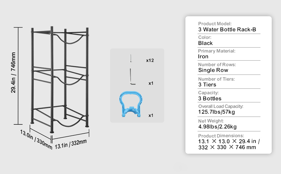 This 3-tier water jug holder measures 13 x 13 x 29 in, holds up to 3 bottles and supports up to 125.7 lbs. Its minimalist industrial design fits various interiors, making it an ideal choice for any space.