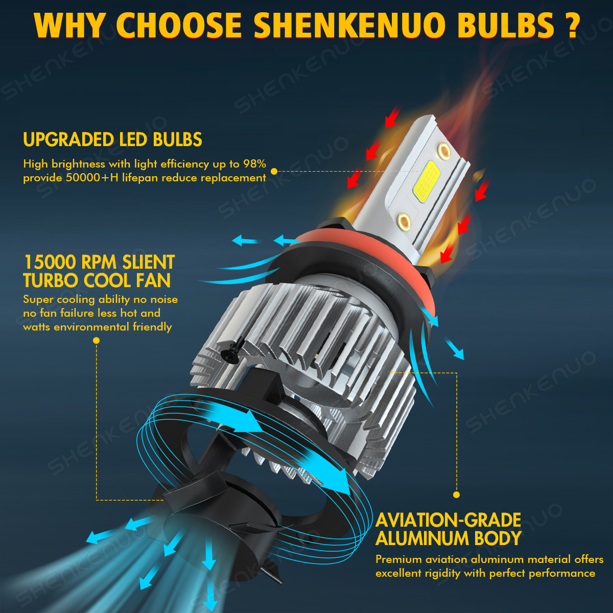 【Longer Lifespan】Adopt whole aviation aluminum body with top LED chips. Unique hollow carved heat sink design and 12000RPM turbo cool fan provide super cooling ability, which ensures a longer lifespan up to 30000 hours. Housing and fan works even in extreme situations,it always keep working and show a clear bright light.
