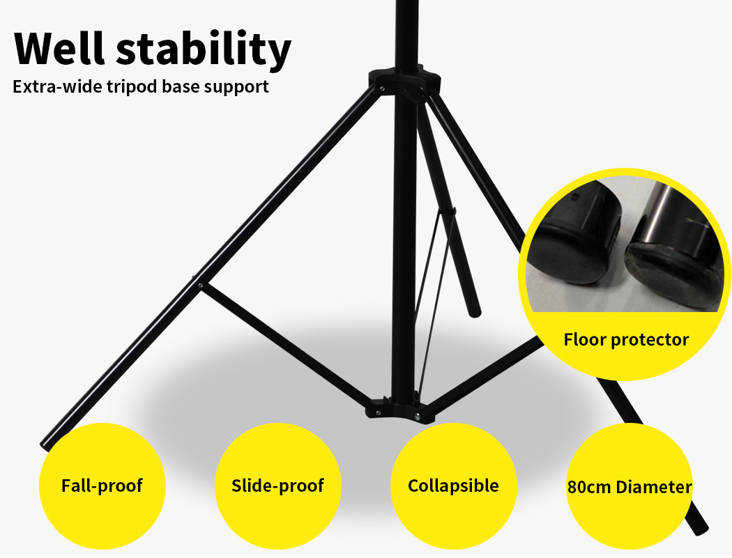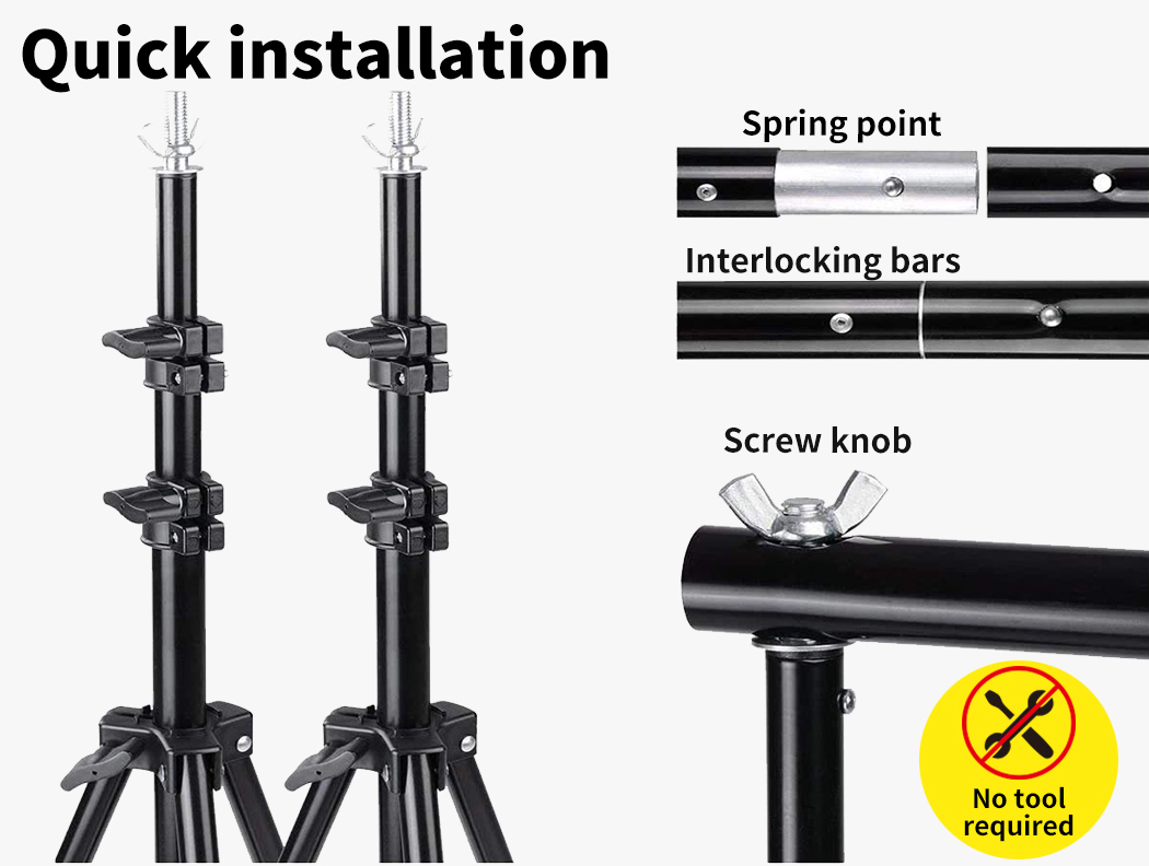 This stand kit is made of toughened metal and steel. Powder-coated to provide exceptional resistance towards rust and corrosion. The poles are 2cm thick in diameter for steady performance all day long. For better stabilization, this stand also comes with weighted sandbags to balance it. All these rugged features make our product fall-free, slide-free, and collapse free.