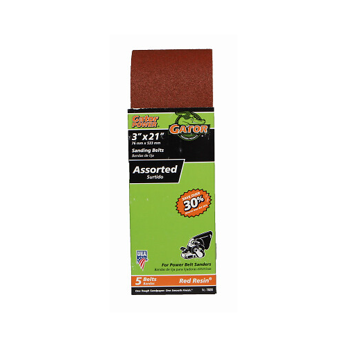 "Gator 5PK 3"" x 21"" Aluminum Oxide Sanding Belts are designed for heavy duty sanding and grinding of wood, metal, fiberglass and painted surfaces. They are made of heavy extra weight cloth for maximum strength and have a resin bonding system that resists heat and humidity, extending the life of the sanding belt. The bi-directional flush joint allows the sanding belt to run smoothly in both directions. These sanding belts are for use on power belt sanders."