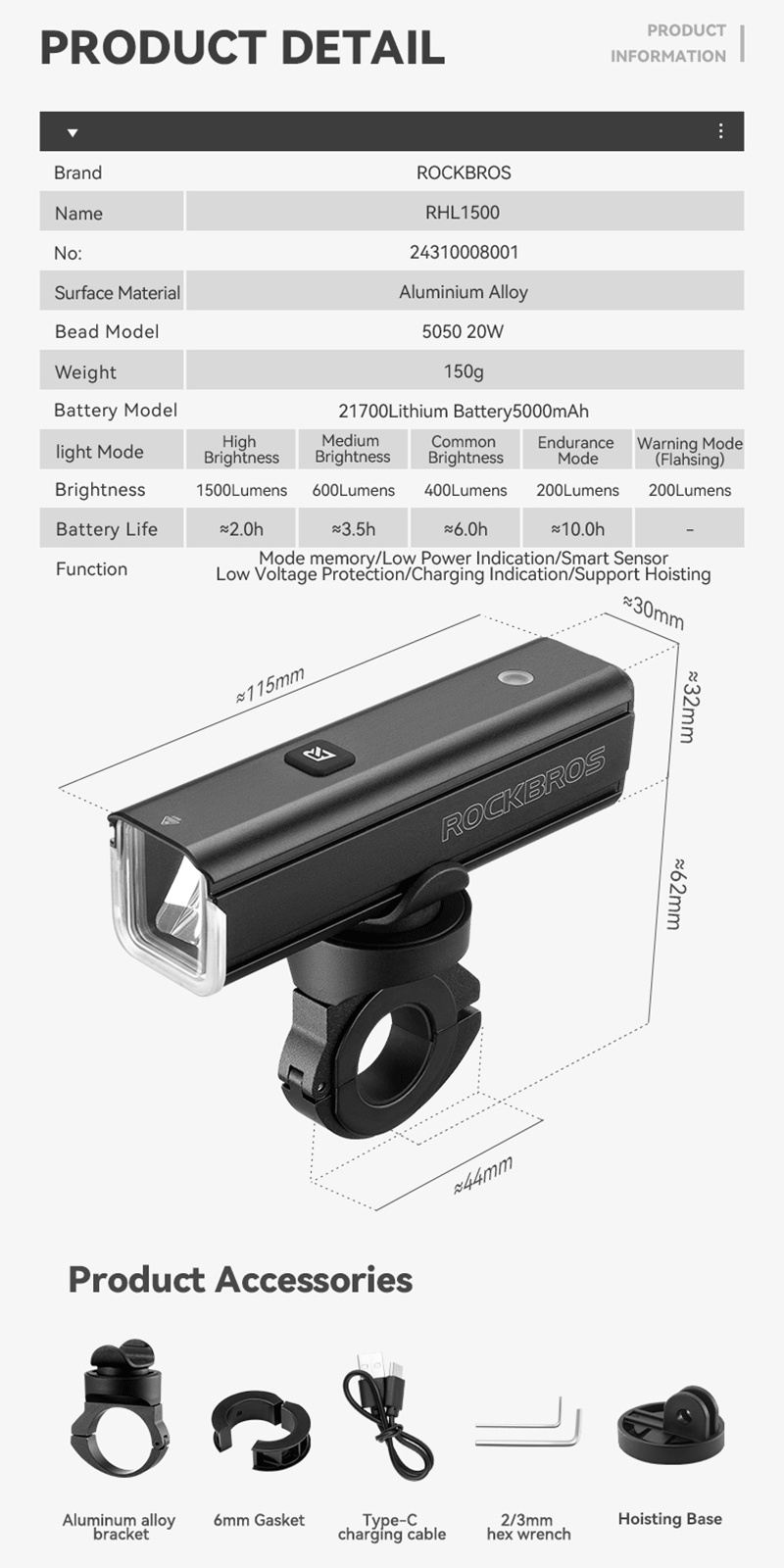 Bright light & Big Battery capacity--It has 1500 Lumens brightness, which can lighten over 200 meters range. Come with 5000 mAh large battery, which can last 10 hours(in 200 lumens mode)