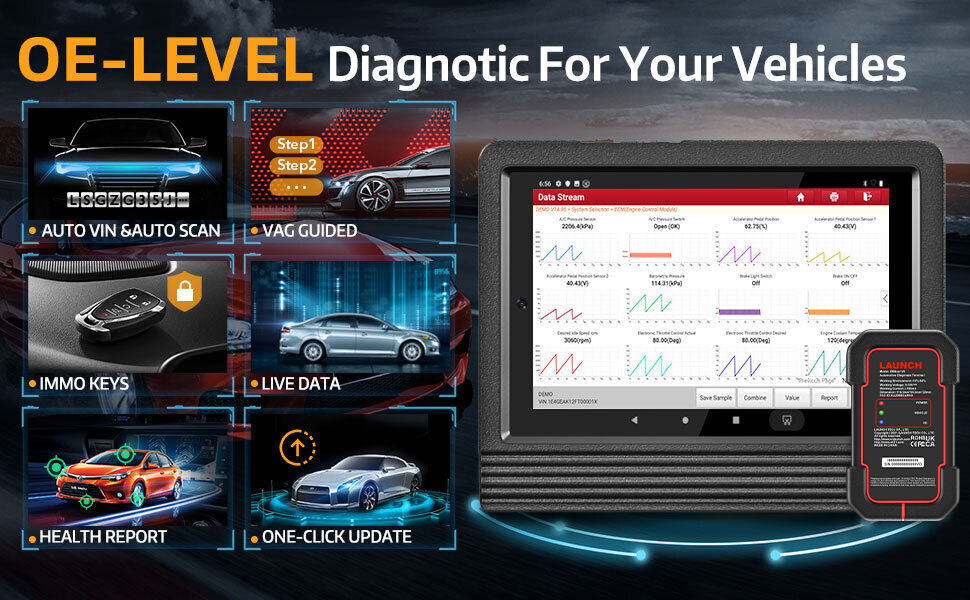 [Alle Systemdiagnosen]: LAUNCH Diagnosegerät ruft ECU Informationen und führt OE Level Diagnose auf allen verfügbaren Fahrzeugsystemen (Motor, Getriebe, ABS, SRS, Kraftstoff, Fahrwerk, etc,.) wie lesen und löschen Codes, Ansicht Datenstrom und Fahrzeuginformationen. [Aktive Test] Pinpoint Auto Probleme durch das Senden der Befehle an ECUs, das Lesen der Daten, und die Überwachung der Fahrzeug Subsysteme und Komponenten.