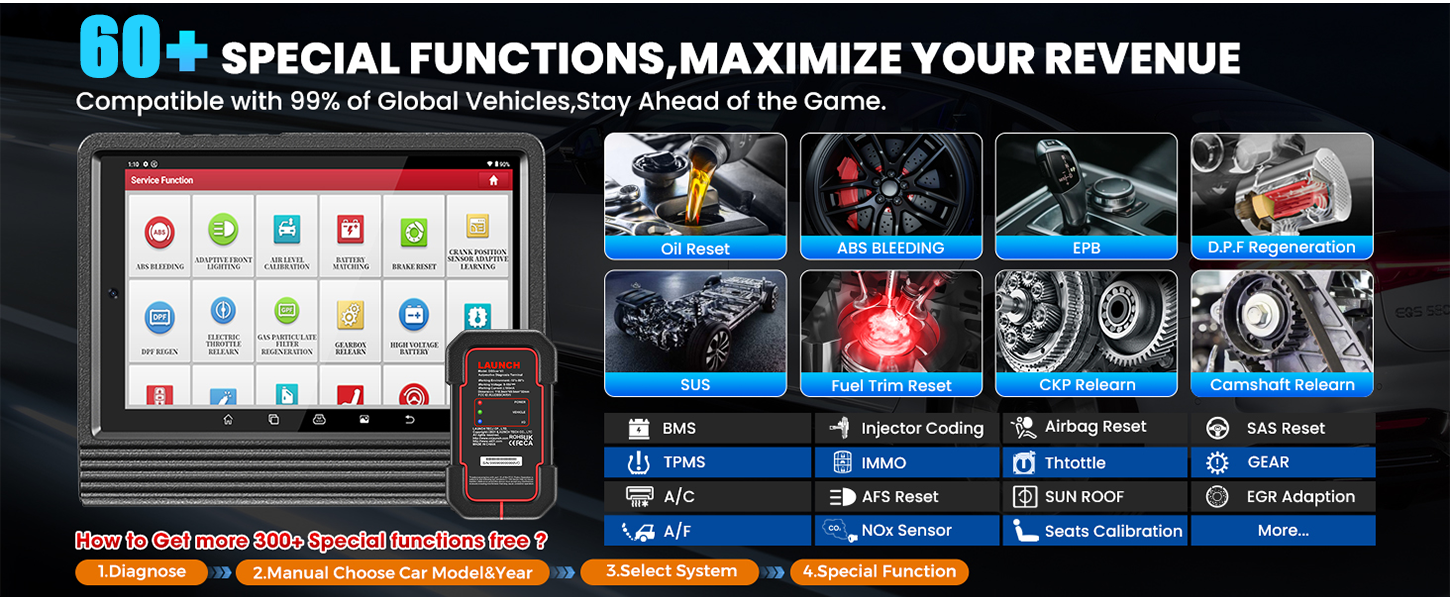 >> Über 100 Reparaturfunktionen für bestimmte Fahrzeuge (Katalog im Fahrzeug) Darüber hinaus hat das Launch-Scan-Tool auch über 300 Funktionen für bestimmte Modelle entwickelt. Verglichen mit anderen Diagnosescannern, die nur die Reset-Funktion ausführen können, kann der bidirektionale Scanner tiefere und breitere Resets, Regenerationen, Initiierungen, Anpassungen, Kalibrierungen, Ersetzungen usw. durchführen.