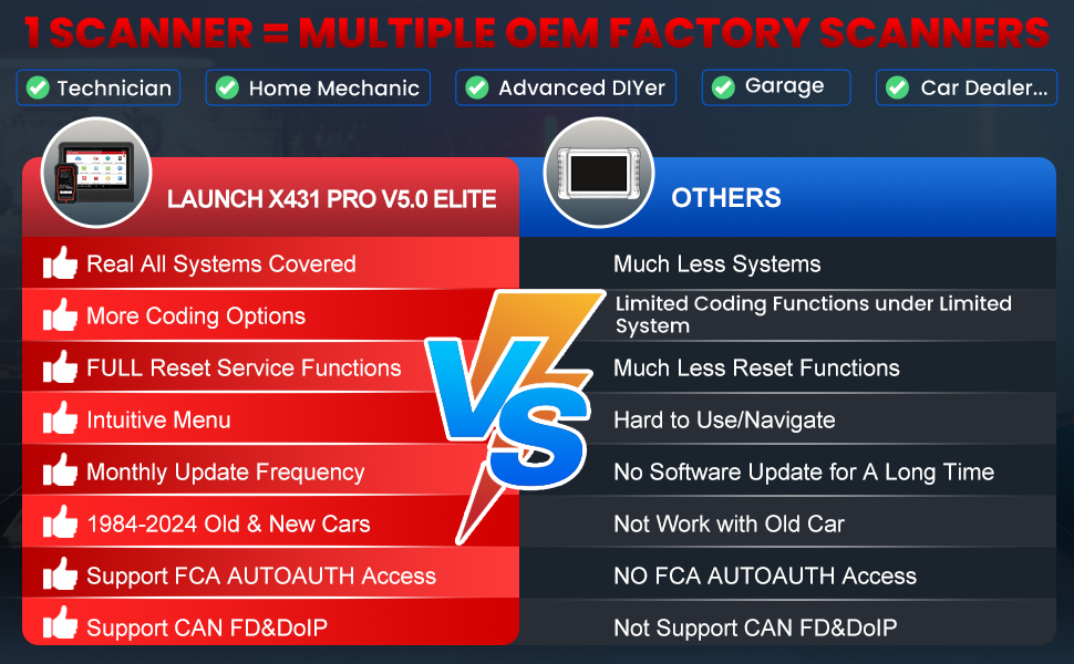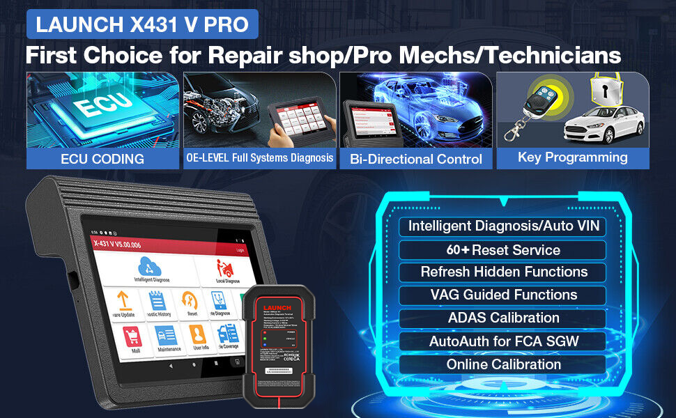 [2026 Elite Scanner]: LAUNCH X431 V PRO hat die gleichen 37 Reset-Funktionen wie LAUNCH X431 PROS V , aber bequemer und schneller. Entwickelt mit vielen vielseitigen Funktionen wie ECU-Codierung, Personalisierung, Guide-Funktion für VAG, Component Matching, Online-Konto-Login-Service, Power Balance, Online-Parametrierung, etc. Der Abdeckungsgrad steigt auf bis zu 99%. LAUNCH Scanner wird ständig aktualisiert, um mit verschiedenen Autos und Probleme zu behandeln.