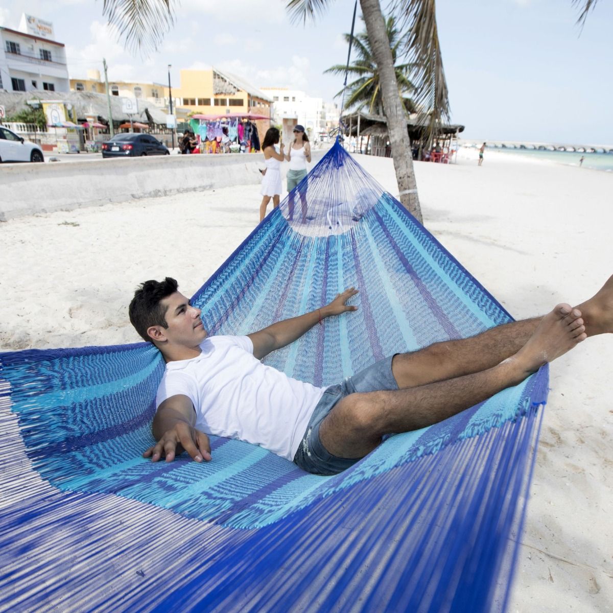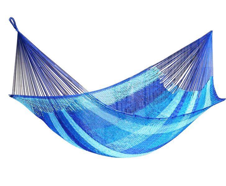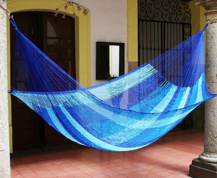 Diese wunderschöne blaue Mehrpersonenhängematte ist original Handarbeit aus Mexiko. Die extra große Hängematte wurde aus Baumwollfäden handgeknüpft ist ist besonders elastisch und atmungsaktiv. Zwei Personen können in dieser großen Netzhängematte bequem liegen und im Garten entspannen.