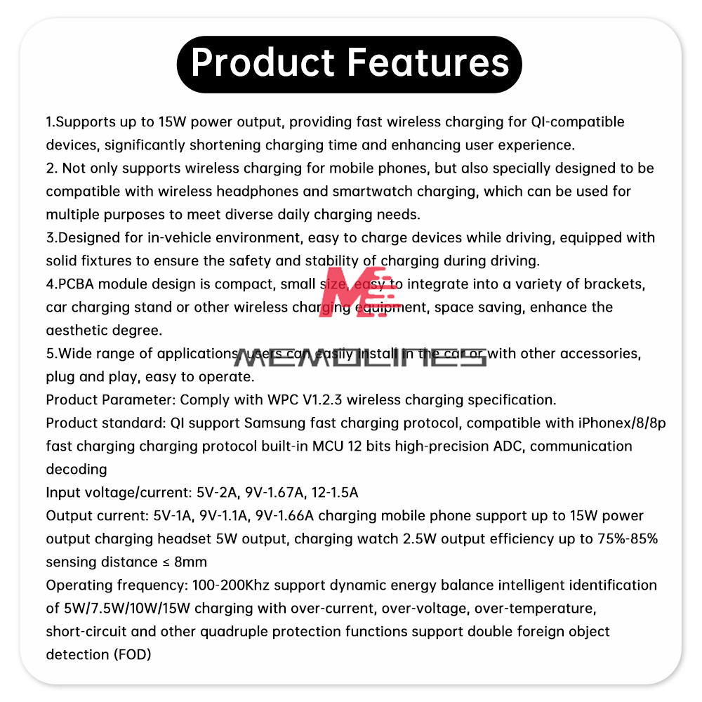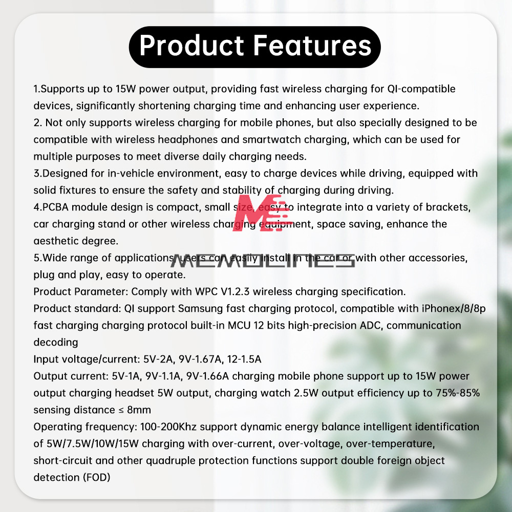 4.PCBA module design is compact, small size, easy to integrate into a variety of brackets, car charging stand or other wireless charging equipment, space saving, enhance the aesthetic degree.